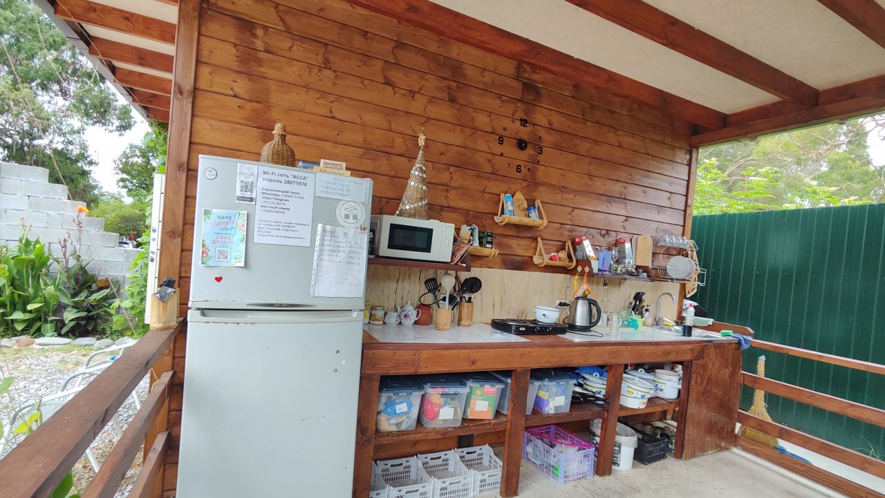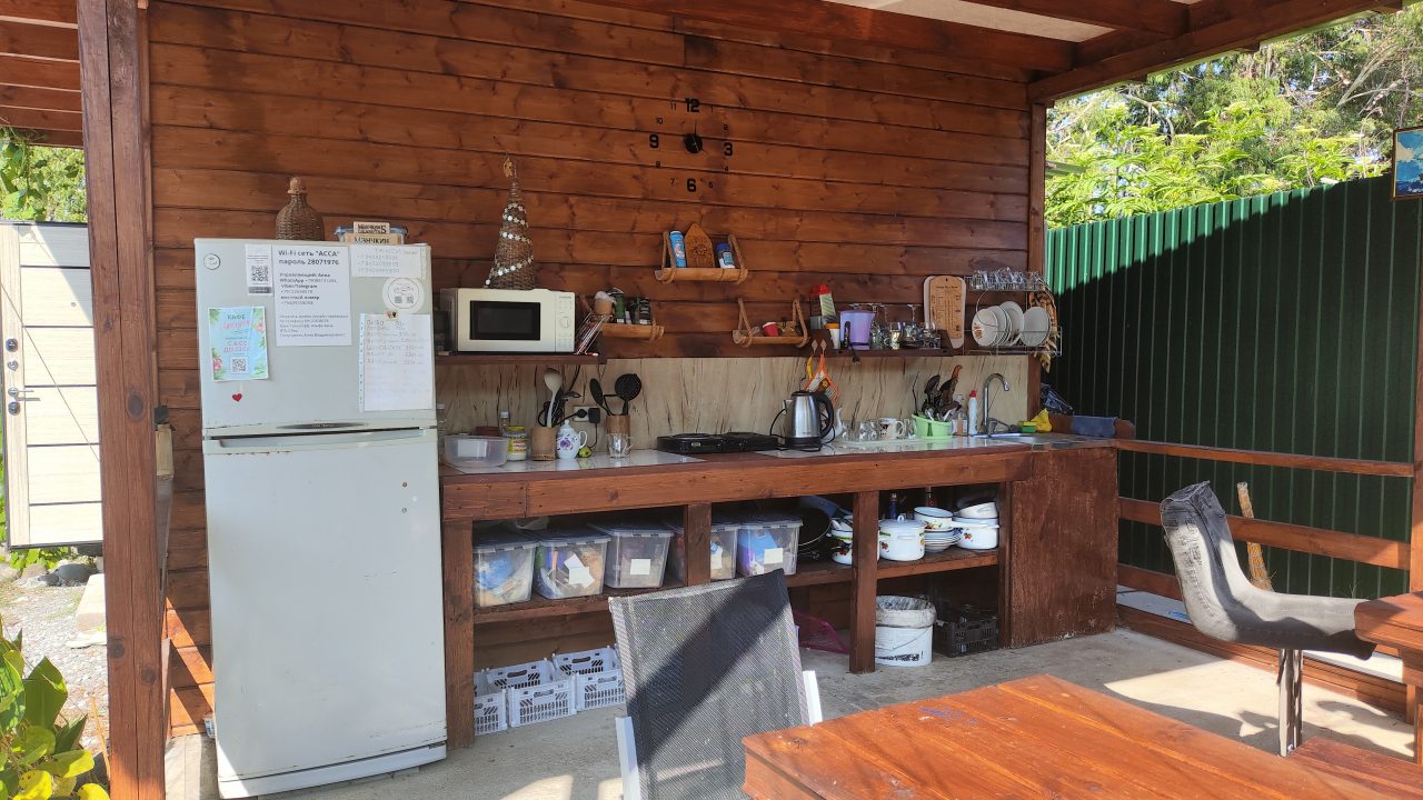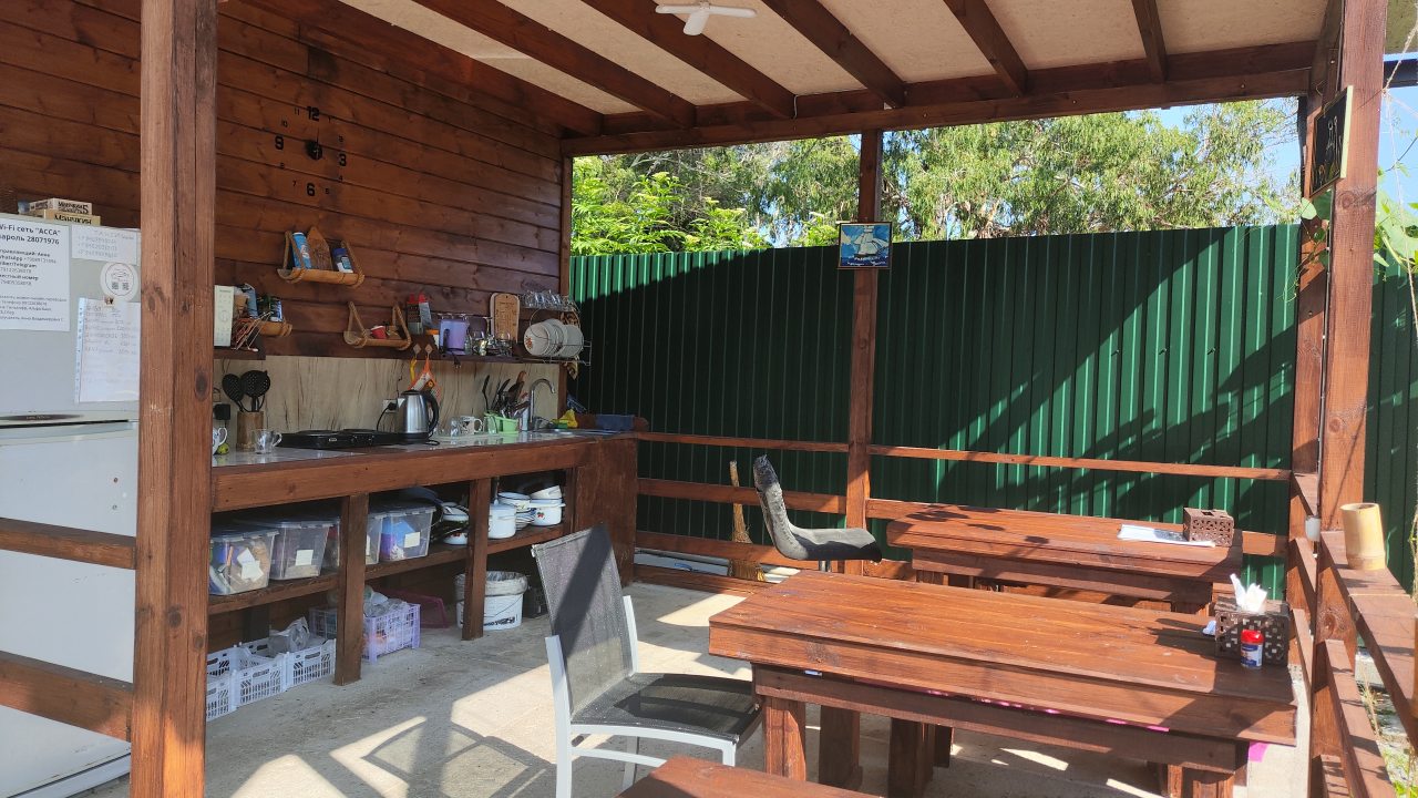 Приготовить еду можно на общей летней кухне. Имеется такая техника, как холодильник, чайник, электрическая плита, посуда. Есть мангальная зона с принадлежностями для барбекю. Кафе и продуктовые магазины располагаются в пешей доступности.