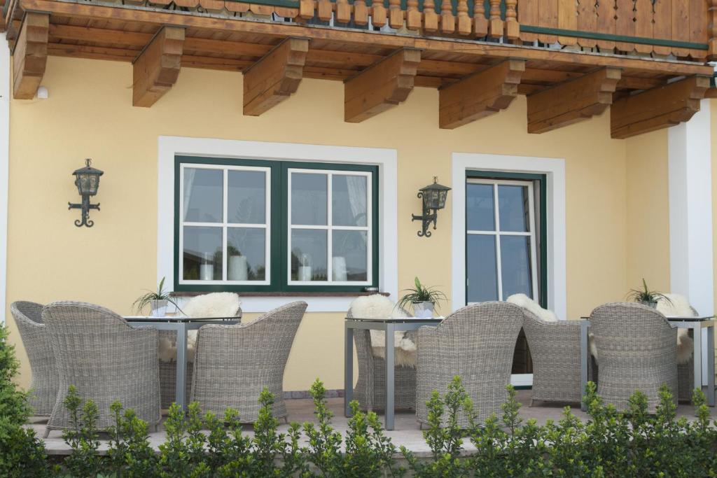 Летом завтрак или ужин может быть сервирован на крытой террасе с видом на Унтерсберг.