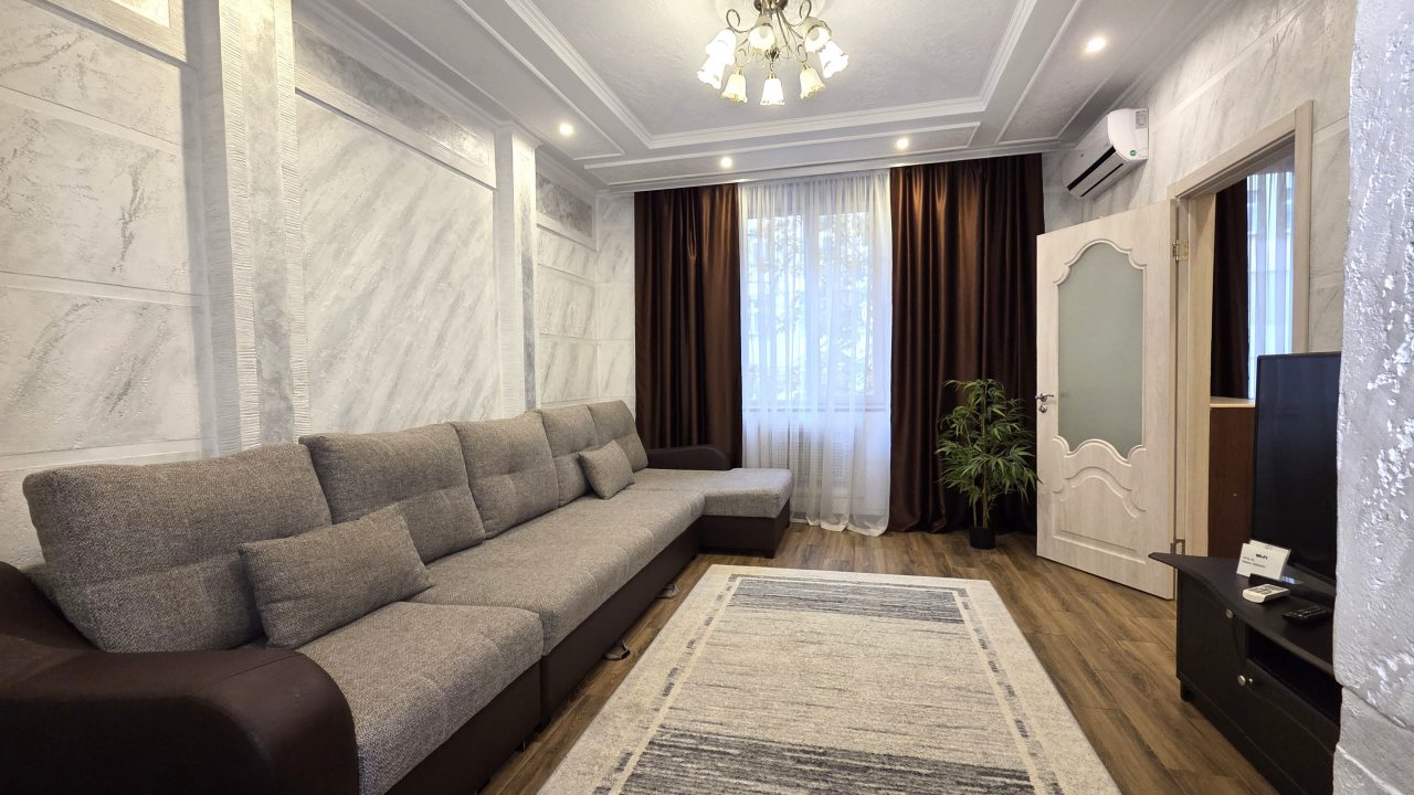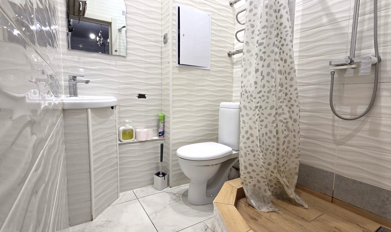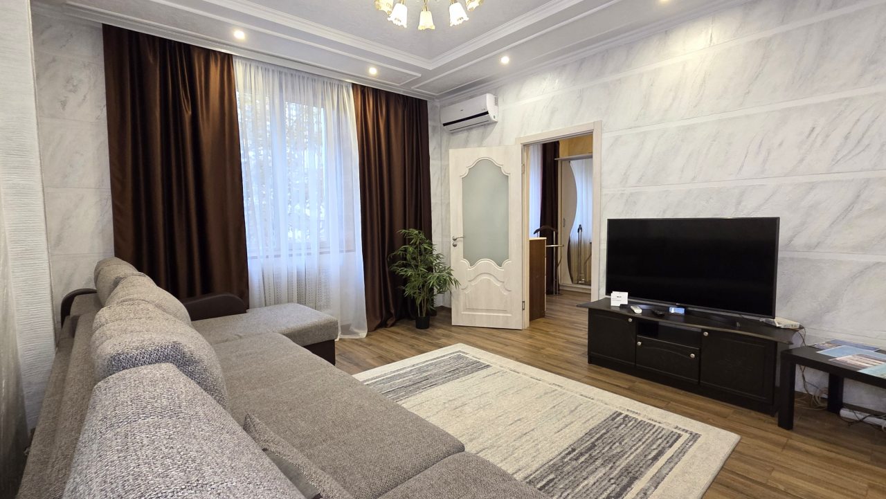 Апартаменты оснащены двуспальной кроватью, раскладным диваном, шкафом, журнальным столиком, прикроватными тумбочками для комфортного проживания гостей. В гостиной отдыхающие могут смотреть свои любимые фильмы на ЖК-телевизоре, регулировать температуру воздуха при помощи кондиционера. Ванная комната оборудована стиральной машиной и душевой кабиной. В распоряжении гостей набор постельного белья и полотенец, гладильные принадлежности, фен.
