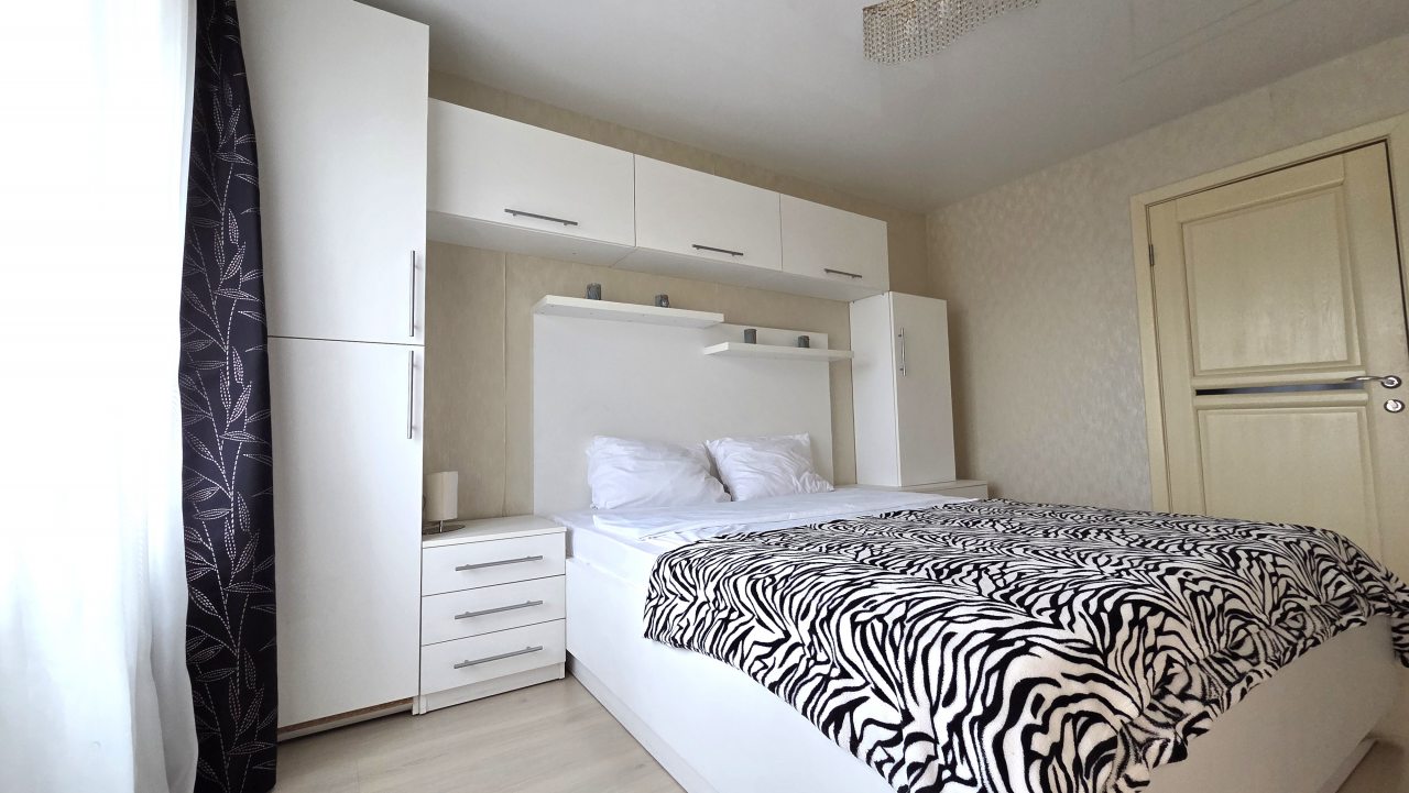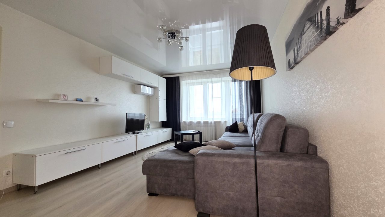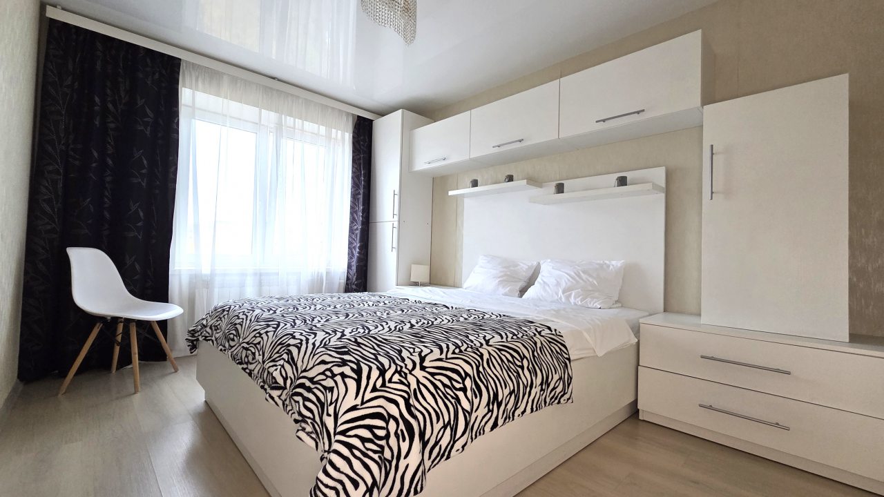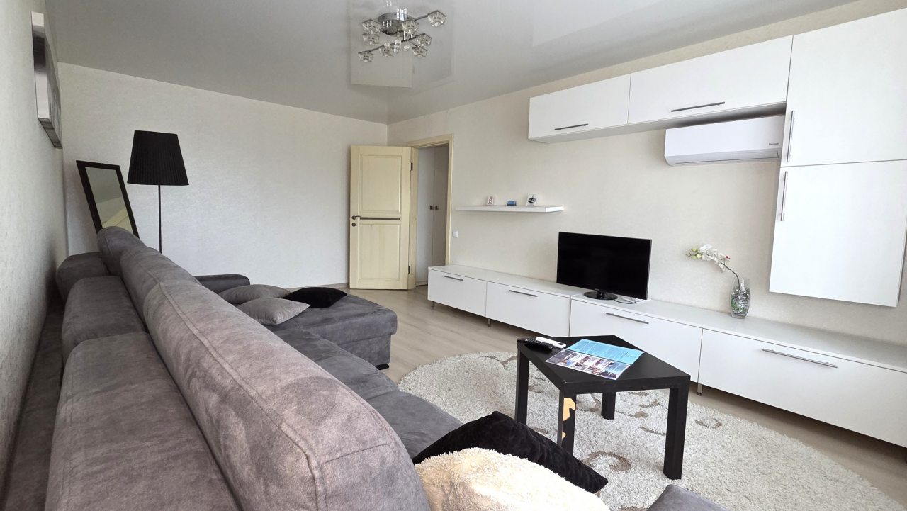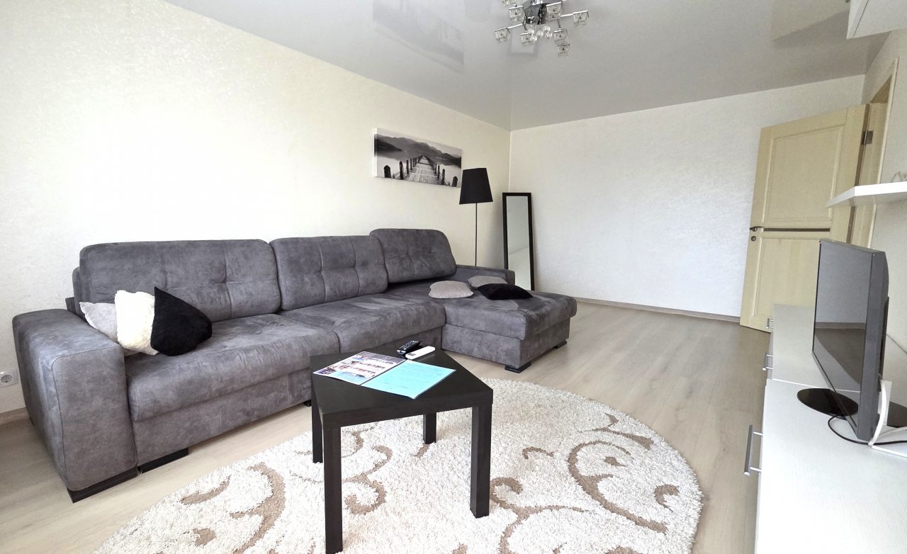 К проживанию предлагается просторная четырёхместная квартира, которая оснащена современной мебелью и техникой, а именно: двуспальной кроватью с комплектом свежего пастельного белья, большим раскладным диваном, прикроватными тумбочками, настенными полками, журнальным столиком, зеркалом, кондиционером. Здоровому сну поспособствуют плотные шторы на окнах. Вечером можно расслабиться перед телевизором. Быть на связи с родными поможет скоростной интернет. Санузел оборудован сантехникой, стиральной машиной, средствами гигиены, феном, чистящими средствами, набором полотенец.