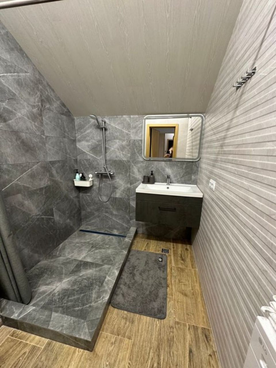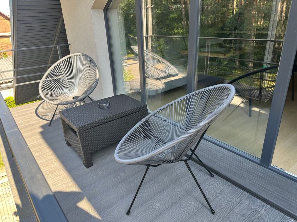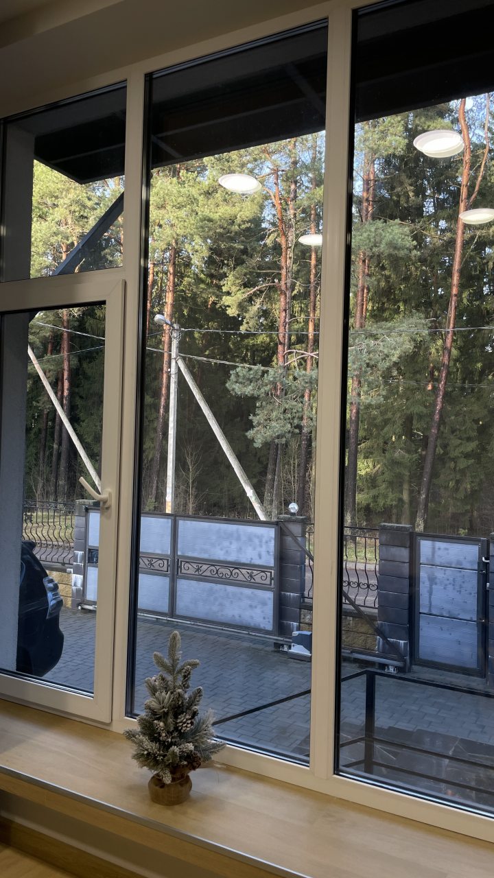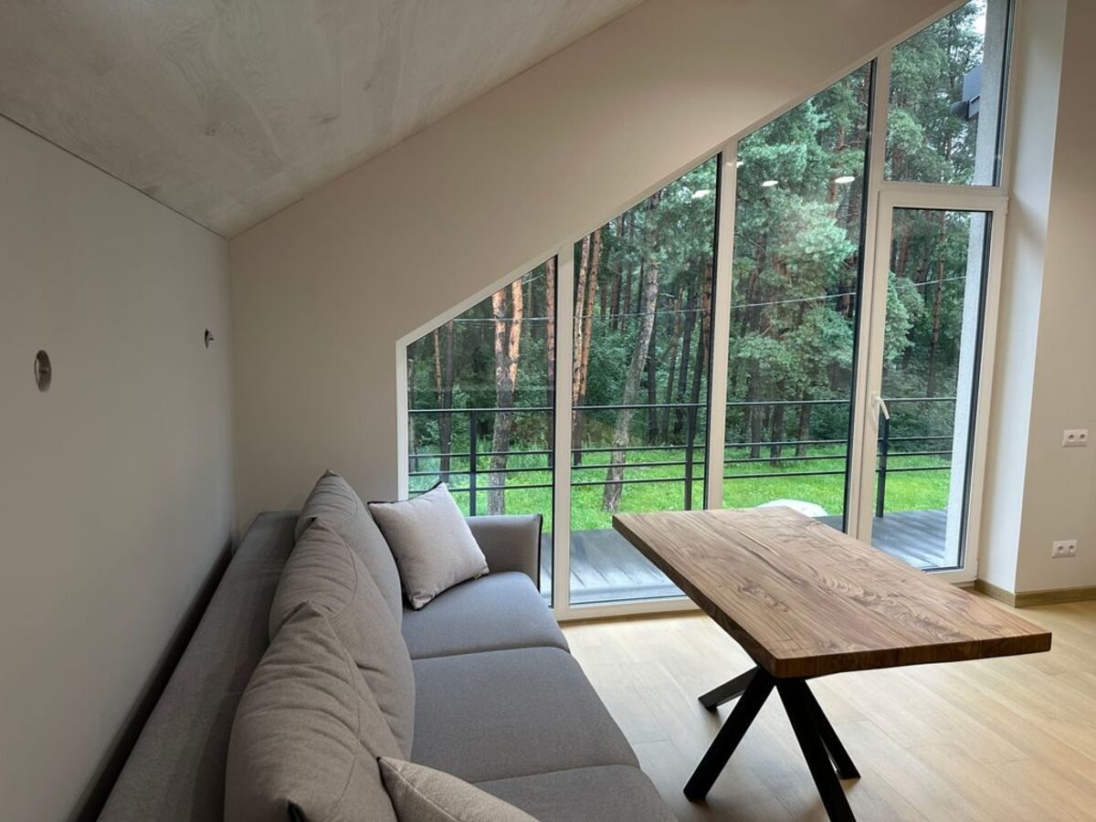 Внутри продумано всё для полноценного отдыха и комфортного проживания, включая панорамное остекление, благодаря которому можно созерцать живописную и ухоженную территорию с деревьями, удобный диван с телевизором, двуспальную кровать, санузел со стиральной машиной и душем.