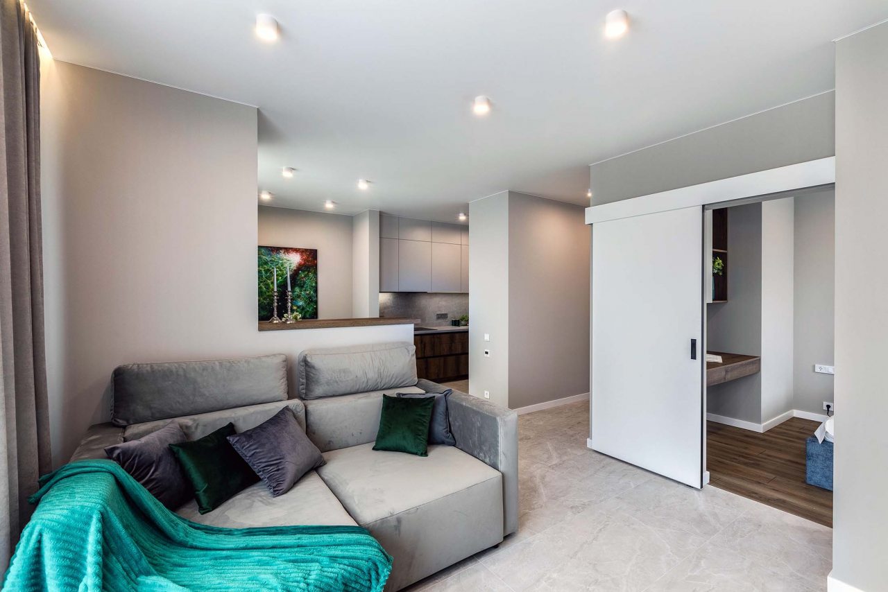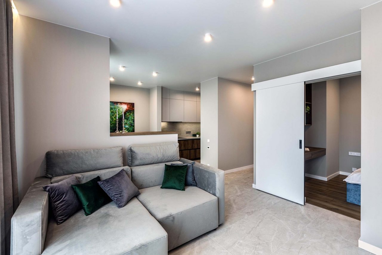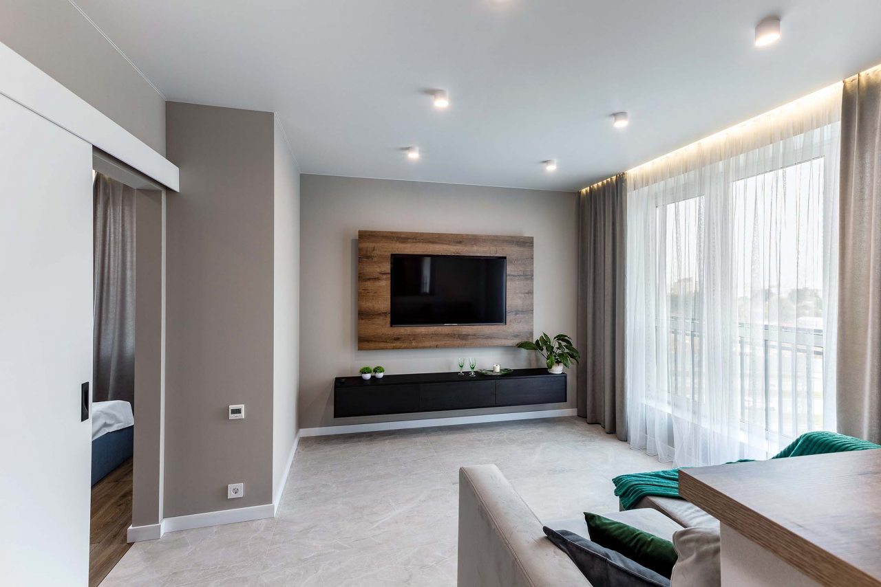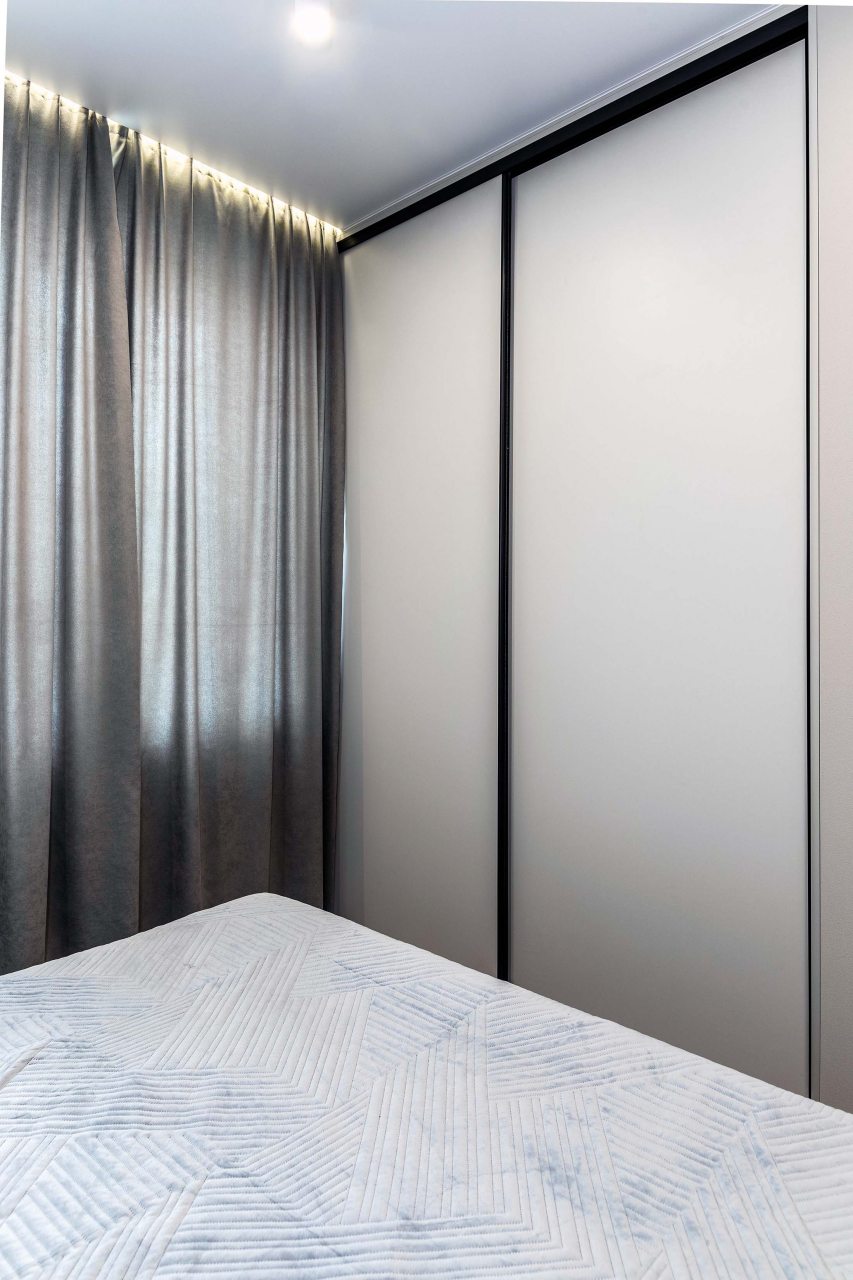 Внутри гостей ожидает мягкая двуспальная кровать, удобный диван, телевизор, вместительные шкафы, плотные шторы для лучшего сна, стиральная машина, а также современный санузел с душевой.