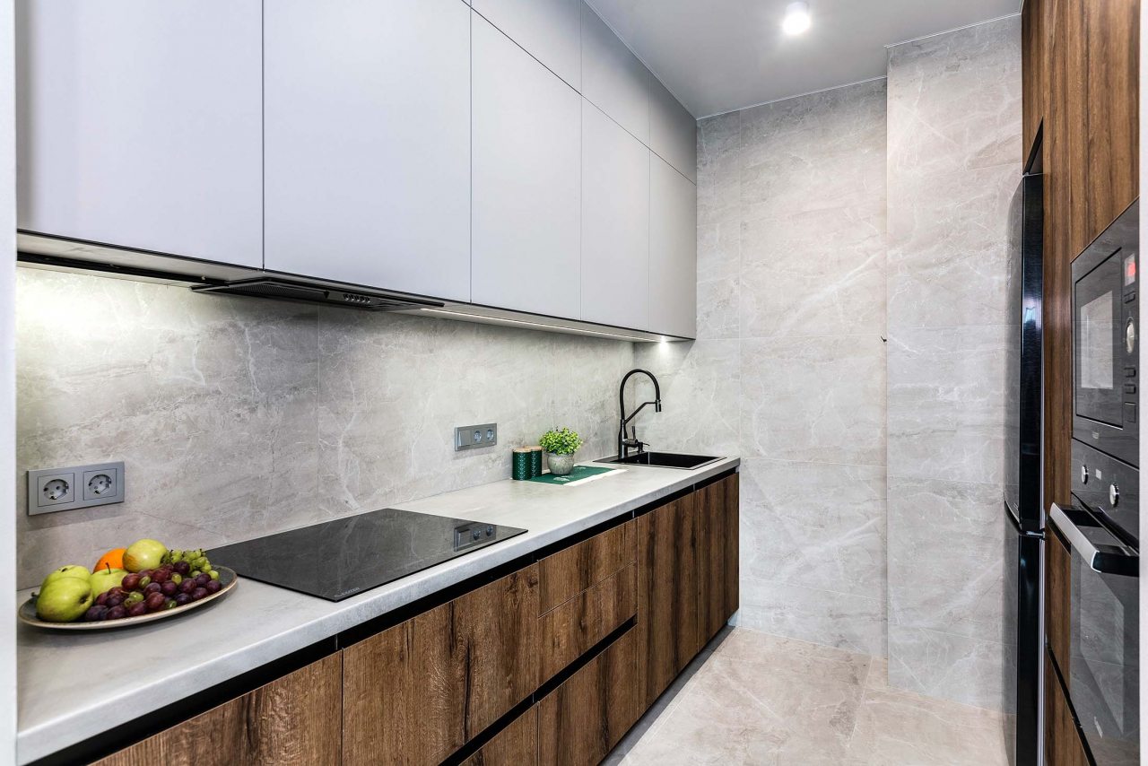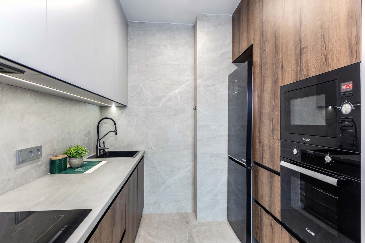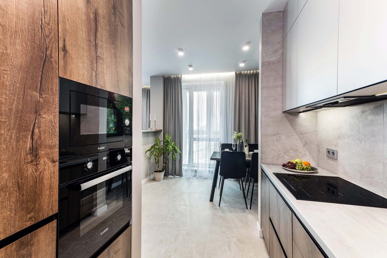 На кухне вы сможете осуществить любую кулинарную задумку, так как в наличии духовой шкаф, плита, СВЧ-печь, холодильник, уютная обеденная зона.