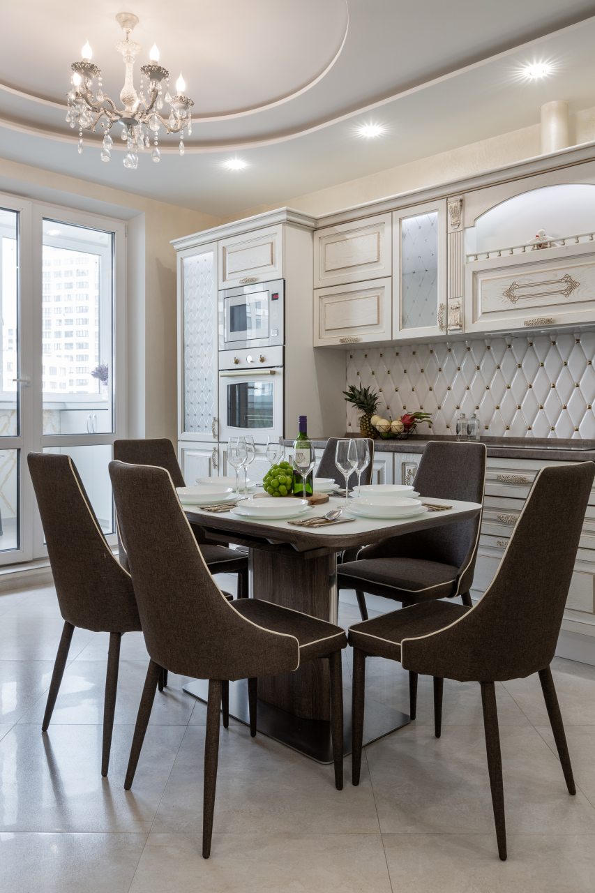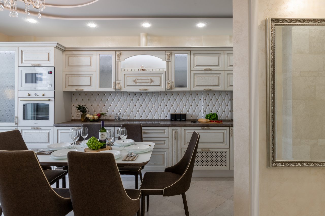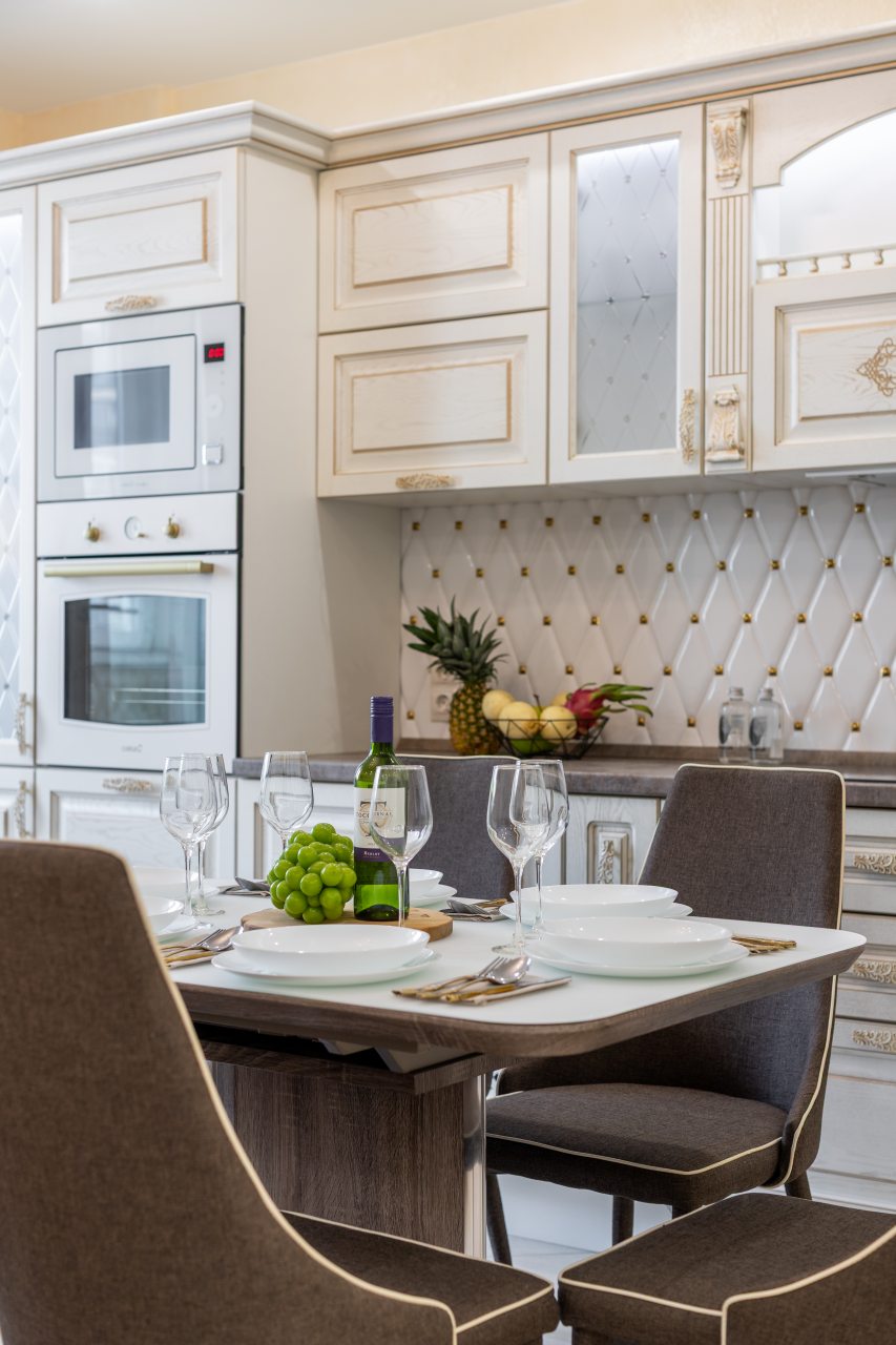 На светлой кухне будет приятно и удобно готовить любимые блюда, поскольку она укомплектована как уютной обеденной зоной, так и варочной панелью, чайником, СВЧ-печью.