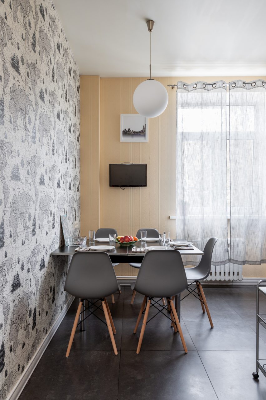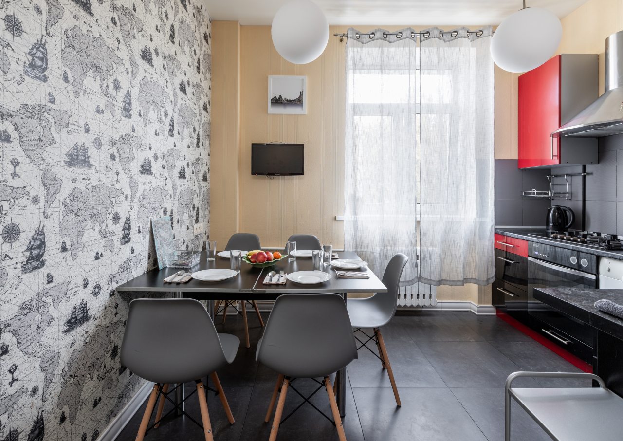 Кухня полностью укомплектована бытовой техникой, посудой, столовыми приборами. Рядом находятся магазины, кафе, рестораны.