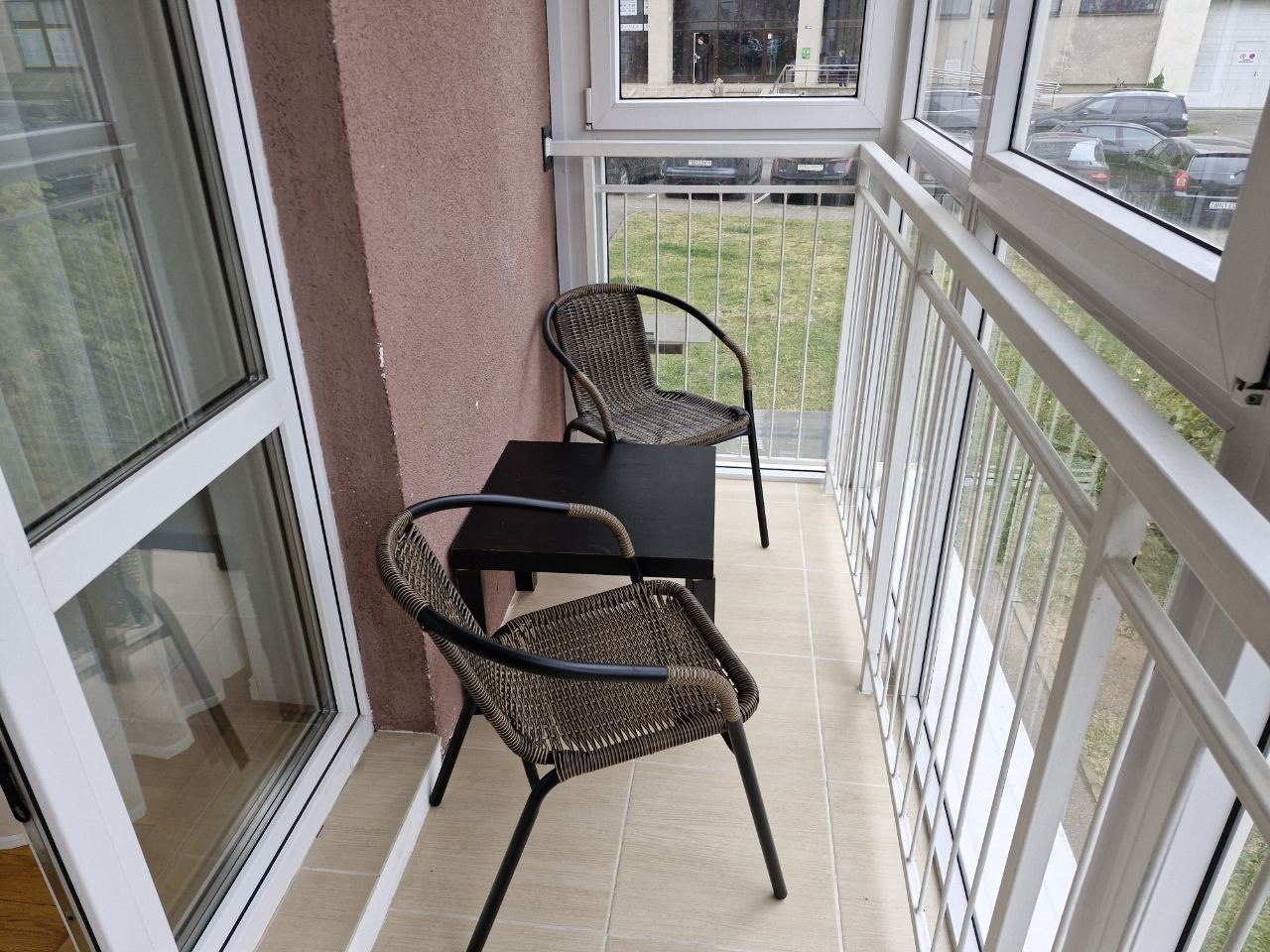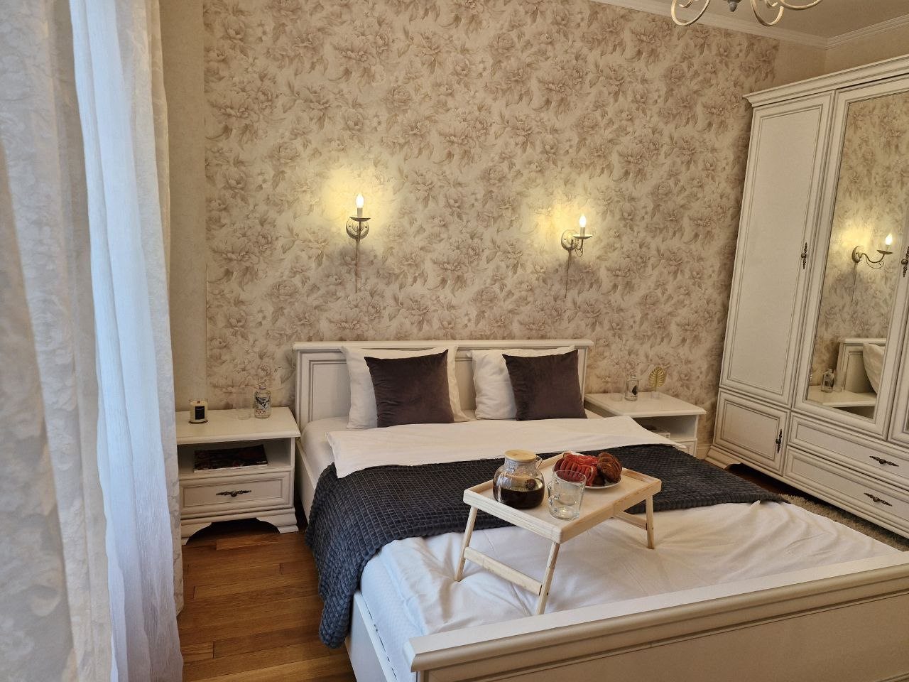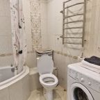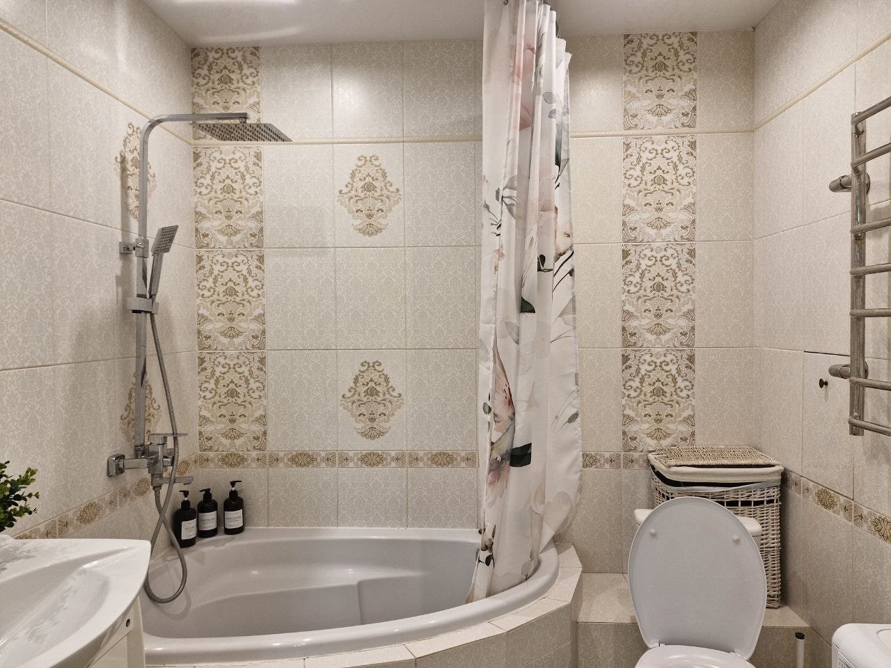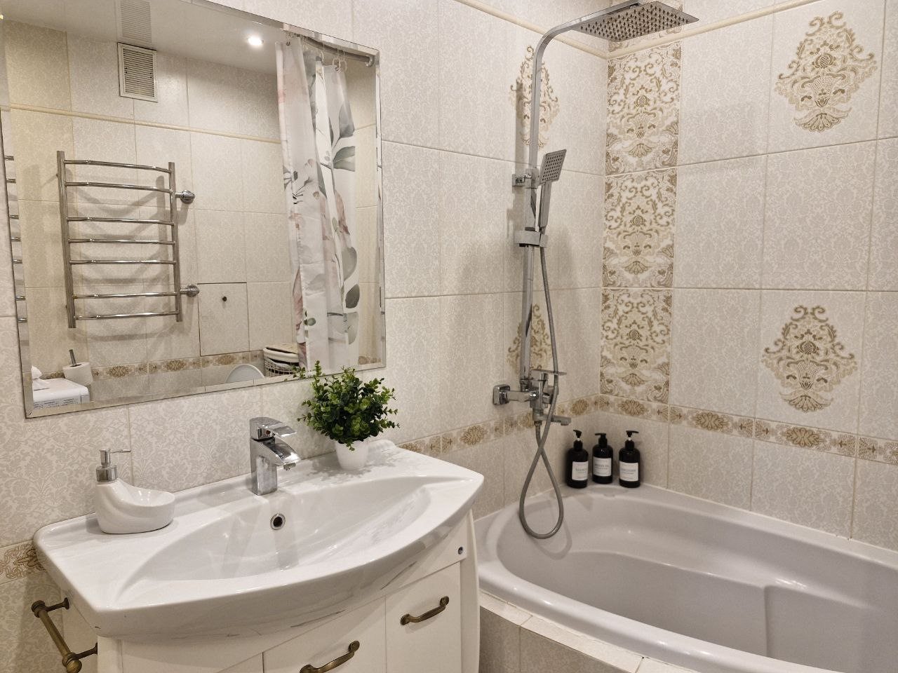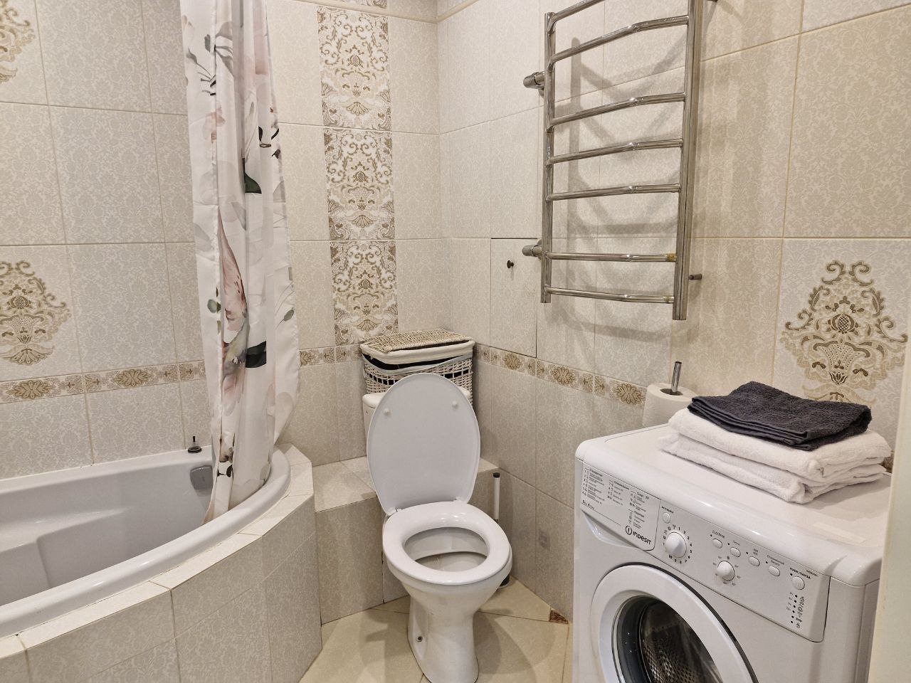 Внутри вас ожидает удобная двуспальная кровать с качественным матрасом, прикроватные светильники и тумбы, шкаф с зеркалом, балкон с панорамным остеклением, мягкий диван с телевизором, а также ванная комната со стиральной машиной, полотенцами и средствами для личной гигиены.