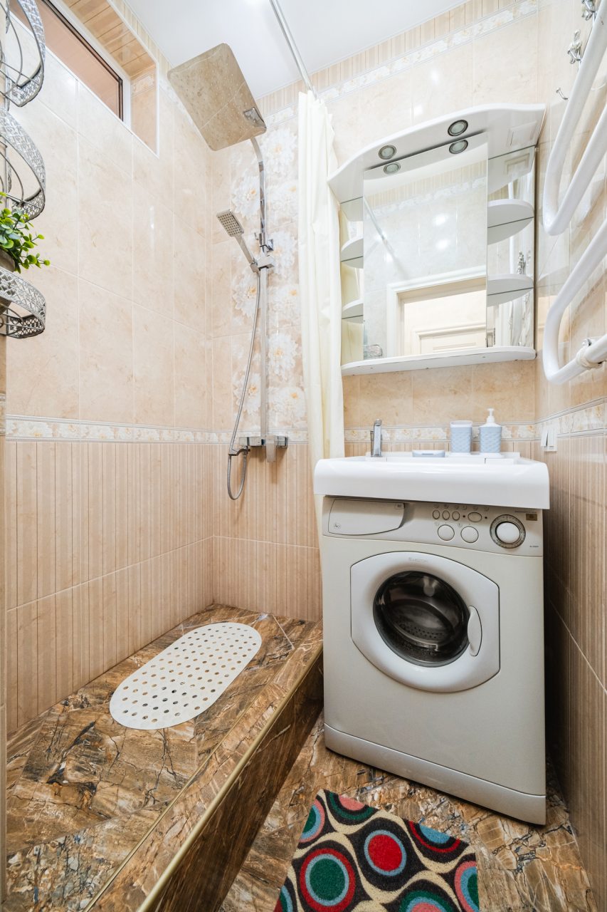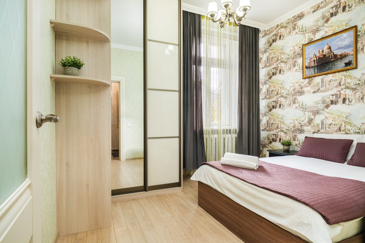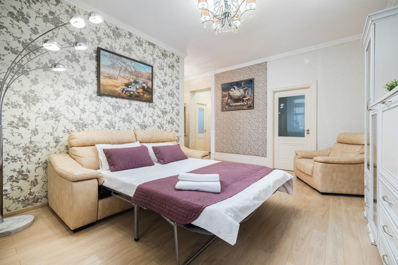 Это вариант подойдет как для индивидуального, так и семейного размещения, поскольку в наличии не только удобная двуспальная кровать, но и раскладной диван. Среди дополнительных удобств — шкаф с зеркалом, раздельный санузел с душем и стиральной машиной, телевизор и мягкое кресло.