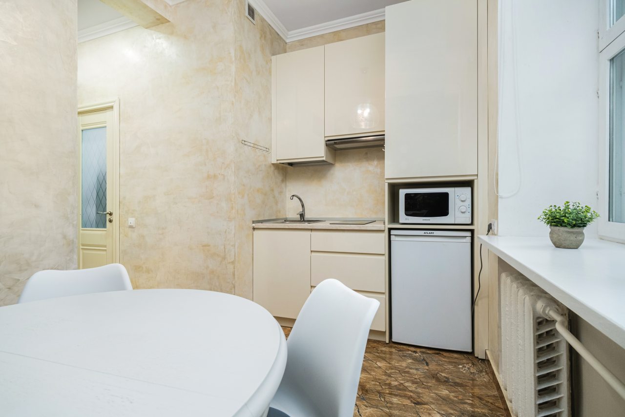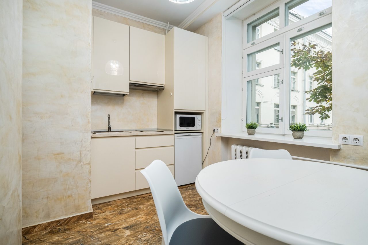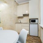 Компактная кухня включает в себя СВЧ, варочную панель, холодильник, обеденную зону. Таким образом, вы всегда сможете порадовать себя любимой едой и напитками.