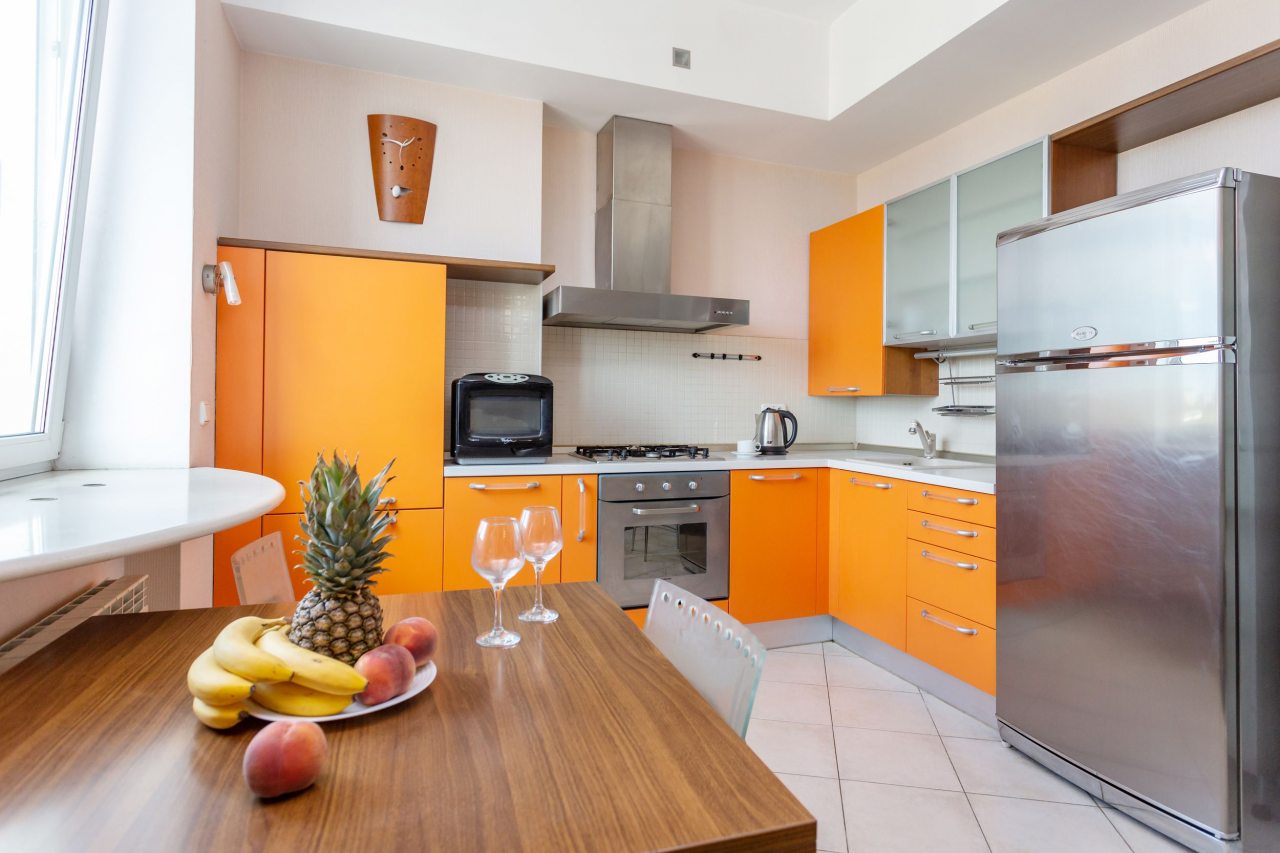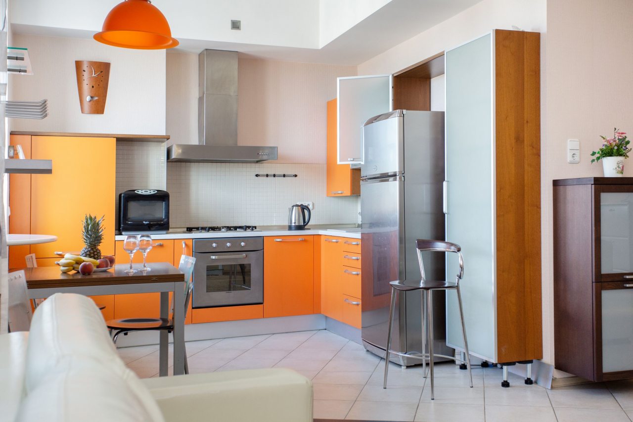 Отдельная область в номере выделена для кухонной зоны, оборудованной необходимыми электроприборами. Есть набор посуды, обеденный стол с комплектом стульев. Рядом с отелем располагаются продуктовые магазины.