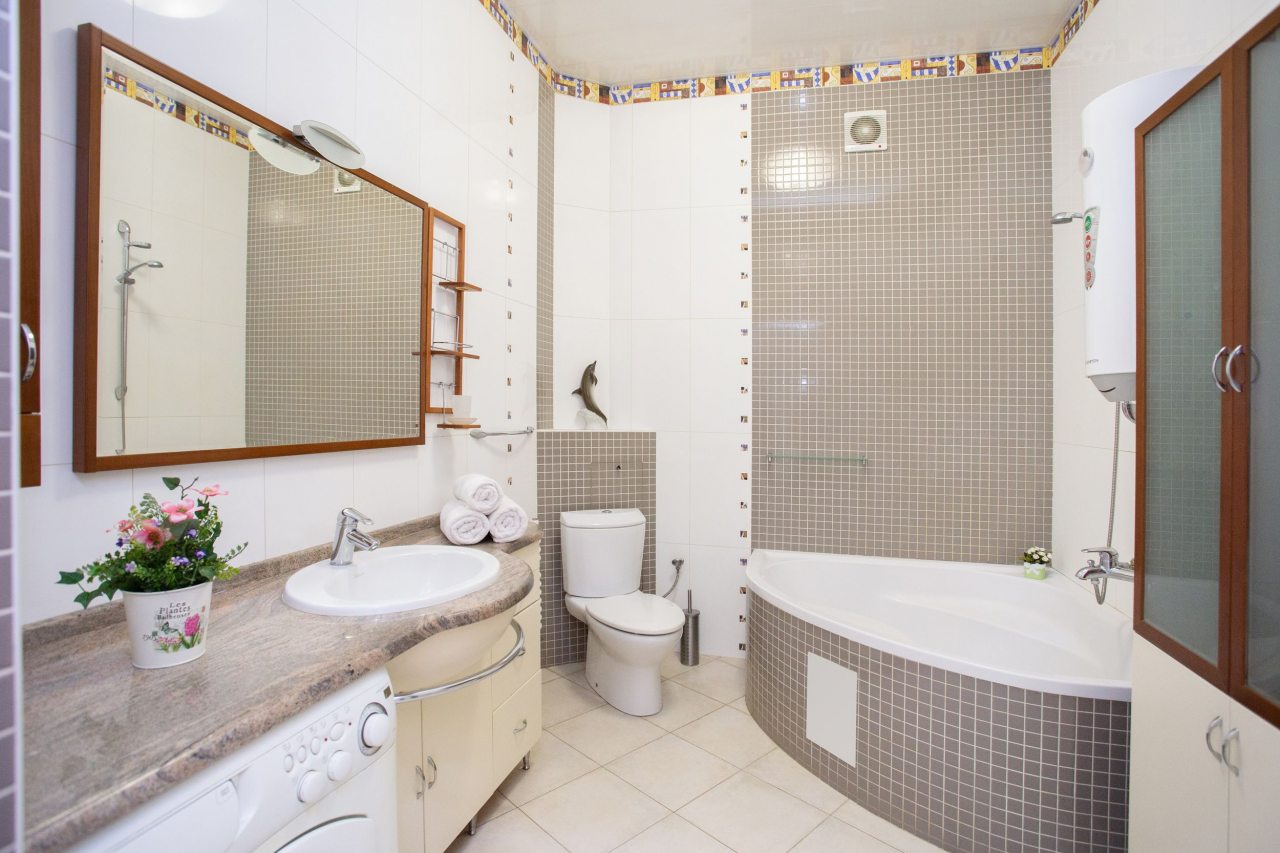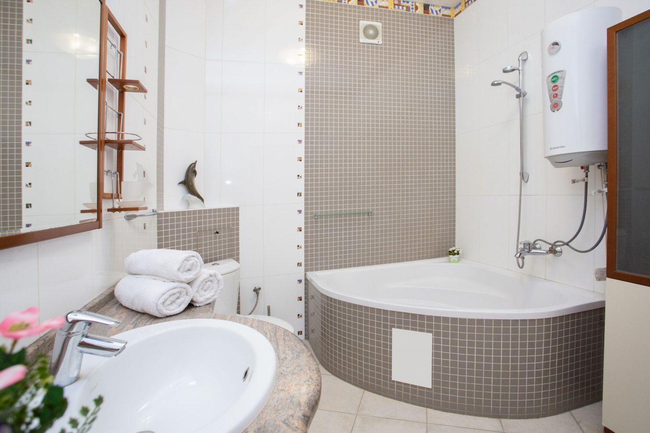 Из недостатков: отсутствие горячей воды. Установили проточный водонагреватель, который нагревал воду только до комнатной температуры, мыться было некомфортно.