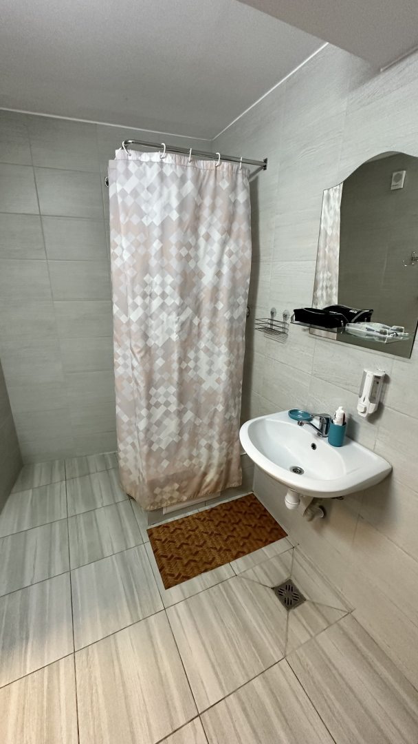 Снимали двухместный номер с мужем. Номер представляет из себя малогабаритную однокомнатную квартиру, где есть всё необходимое. В комнате две кровати, шкаф стол телевизор и выход на большую лоджию. Совмещённый санузел. На кухне имеется холодильник, микроволновая печь, электроплита, и необходимая посуда. Всё чисто. Нам понравилось.
