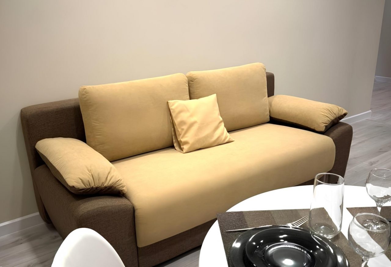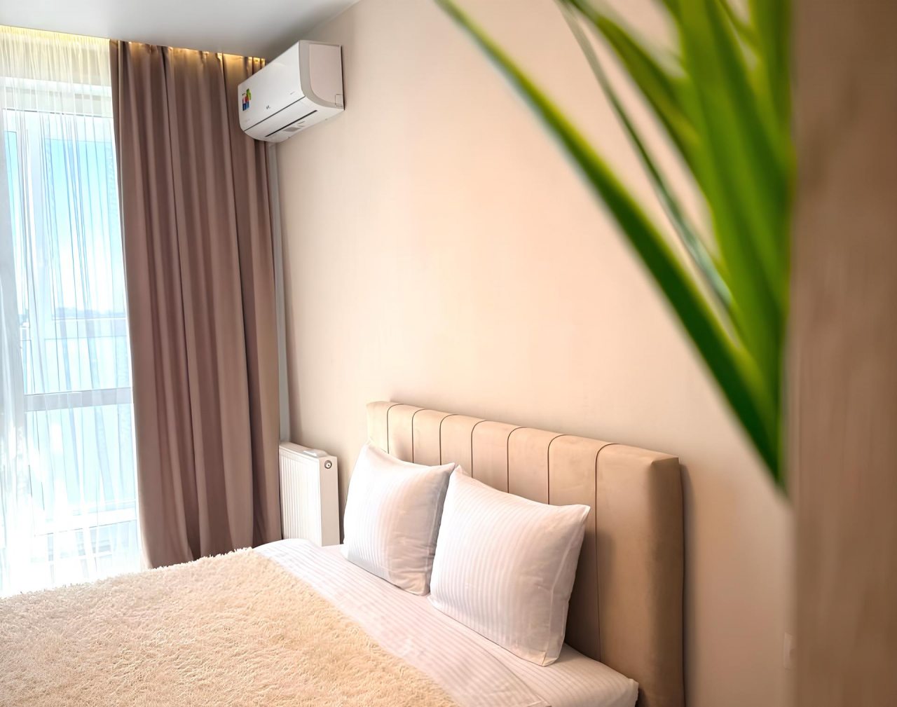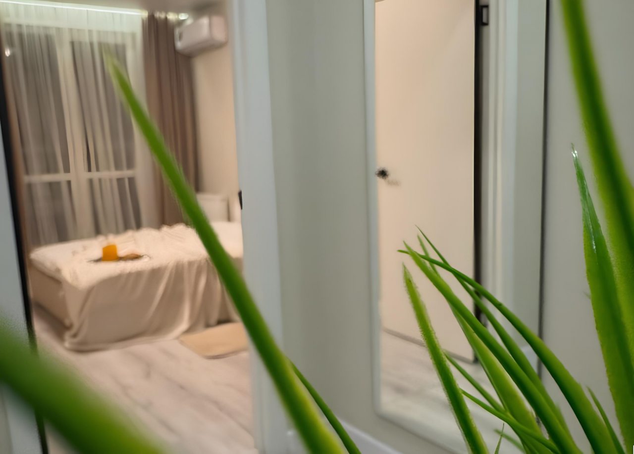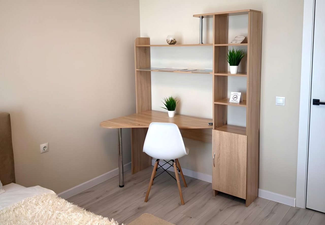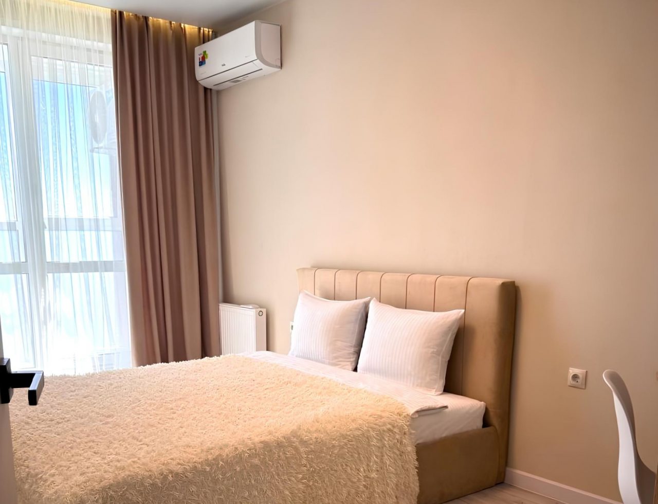 Для качественного отдыха и проживания имеются удобная кровать, затемненные шторы для лучшего сна, письменный стол, мягкий диван, кондиционер, а также санузел со стиральной машиной, душевой и необходимой сантехникой.