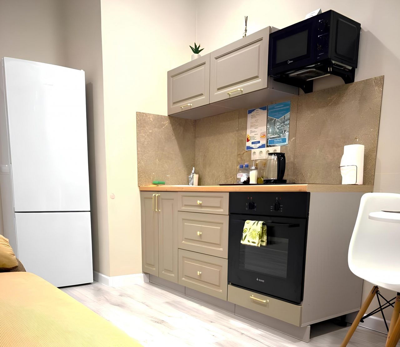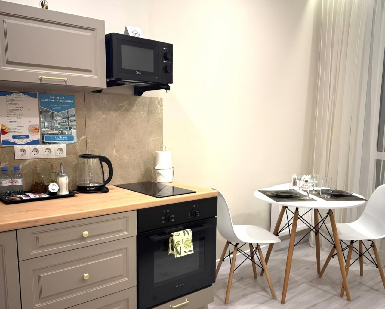 Кухонная зона оснащена плитой, чайником, духовым шкафом, небольшой обеденной зоной, чтобы вы могли в любой момент приготовить любимое домашнее блюдо.