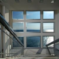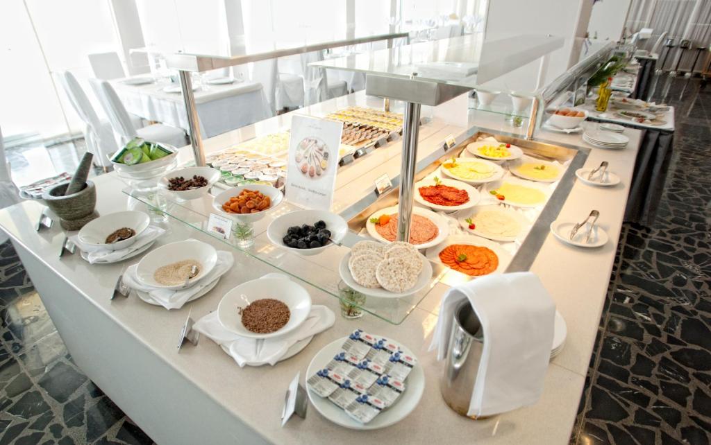Просторный ресторан отеля отделен от берега моря стеклянными стенами.