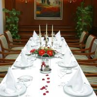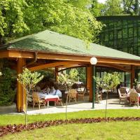 Гости могут насладиться трапезой на крытой солнечной террасе с видом на большой парк, окружающий отель.