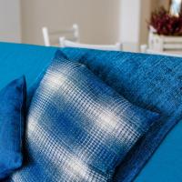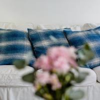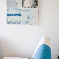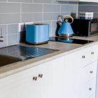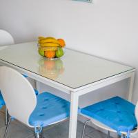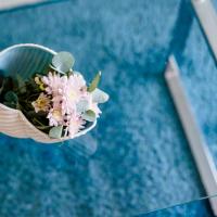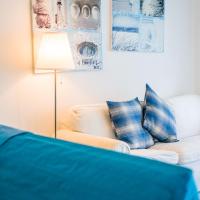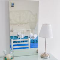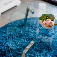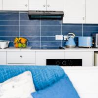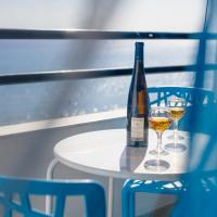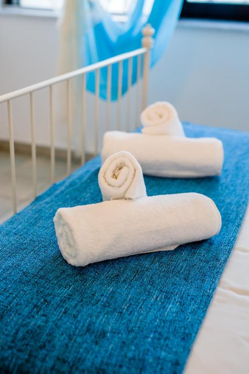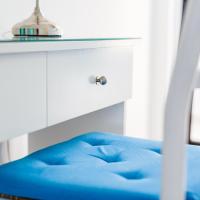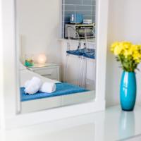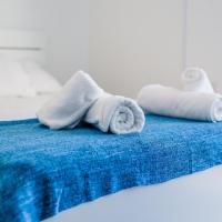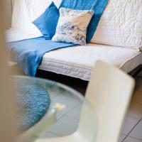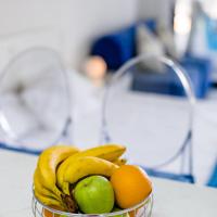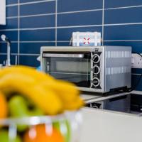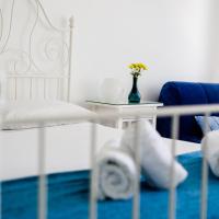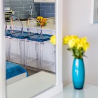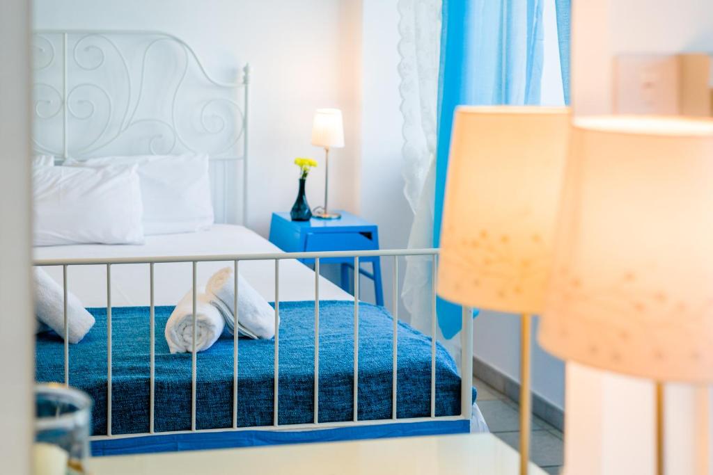 Апартаменты и номера-студио обставлены белой и синей кожаной мебелью.