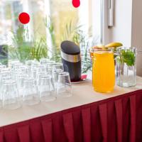 Кофе, чай и вода предоставляются бесплатно в течение всего дня.