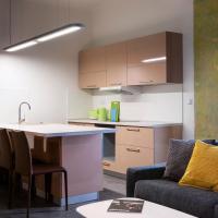 Во всех апартаментах имеется полностью оборудованная кухня с посудомоечной машиной, гостиная зона с диваном, телевизор с плоским экраном и собственная ванная комната с биде и феном.