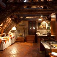 В старинном зале для завтрака с уникальными потолочными балками сервируют горячий завтрак «шведский стол».