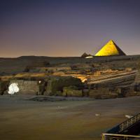 Перед гостями открывается неповторимый вид на пирамиды, Сфинкса и театр, где показывают звуко-световое шоу.