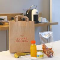 Enjoy our "Breakfast Bag” for 9,50 € and select your choice between : - an organic fruit, a mini chocolate, an original croissant, an organic yogurt and a fresh orange juice - a mini baguette or bread roll with butter, jam and St Moret cheese, an organic yogurt with granola, and a fresh orange juice.