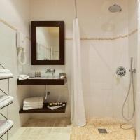 Собственная ванная комната с душем укомплектована халатами и феном.