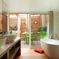 Стильные номера отеля Le Mathurin с облицованной мрамором современной ванной комнатой обставлены изящной мебелью.