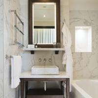 В собственной ванной комнате с полотенцесушителем предоставляются бесплатные туалетно-косметические принадлежности, тапочки, халаты и фен.