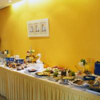 В светлом зале для завтрака отеля Hotel am Buschkrugpark каждое утро сервируют обильный завтрак «шведский стол».