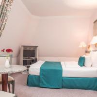 В элегантно оформленном зале для завтрака апарт-отеля имеются люстра, большие эркеры и блестящие деревянные полы.
