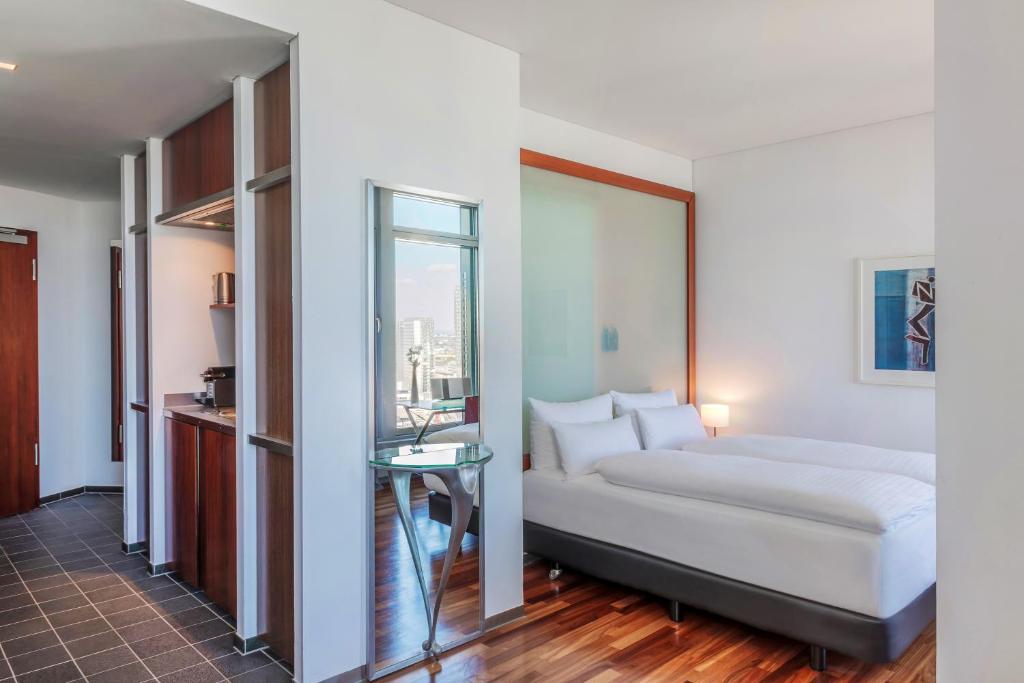 Апарт-отель расположен в одном из небоскребов Франкфурта, начиная с 24 этажа.