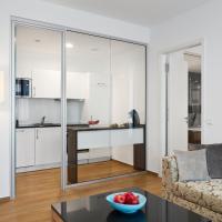 В светлых апартаментах с паркетным полом и панорамными французскими окнами имеется полностью оборудованная кухня, балкон и просторная ванная комната.