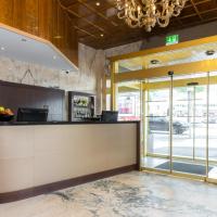 Круглосуточная стойка регистрации находится в облицованном мрамором лобби отеля.