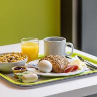В кафетерии отеля, оформленном в ярких тонах, каждое утро подают завтрак «шведский стол».