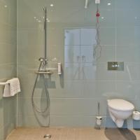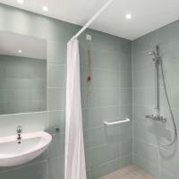 В современной ванной комнате с полом с подогревом и душем предоставляются фен и бесплатные туалетно-косметические принадлежности.