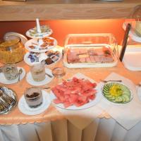 В оформленном в светлых тонах зале для завтрака каждое утро сервируют завтрак "шведский стол".