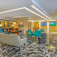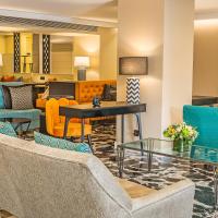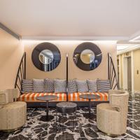 Гостей отеля встречает современный вестибюль, украшенный тканями с тиснением с рисунком.