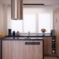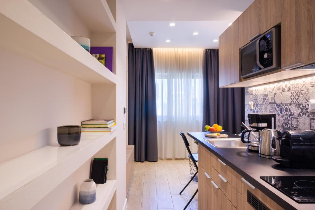 В числе удобств посудомоечная машина, микроволновая печь, холодильник, чайник и кофемашина.