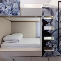 Дизайн отдельных и общих номеров хостела Nubian с паркетным полом выполнен в ярких тонах.