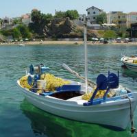 Окна отеля выходят на порт и пляж с золотым песком в небольшом рыбацком городке Панормос.