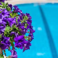 Бассейн окружен ухоженным садом с растениями и цветами.