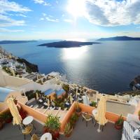 Из отеля Kavalari на вершине кальдеры острова Санторини открывается панорамный вид на Эгейское море и старый порт.
