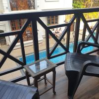 К услугам гостей кухня открытой планировки со столовыми приборами и кухонными принадлежностями, холодильник, микроволновая печь, чайник для приготовления чая и кофе, бесплатный Wi-Fi и большой бассейн.