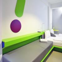 Номера отеля оформлены в современном минималистичном стиле и в красочных тонах, а из их окон открывается вид на город.