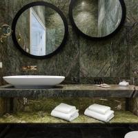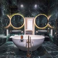 Собственная ванная комната с ванной или душем отделана мрамором.