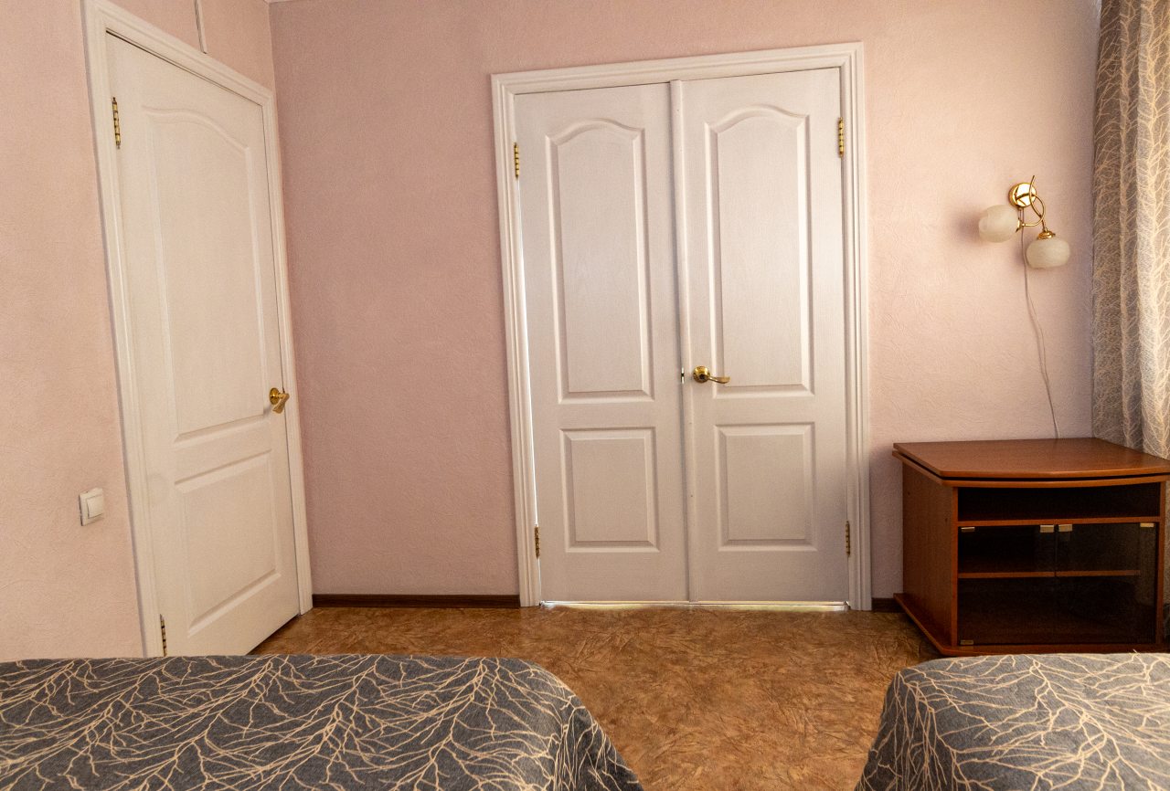 Из недостатков: есть информация что номер с двумя раздельными кроватями, но по факту они совмещены в одну и возможности их раздвинуть нет