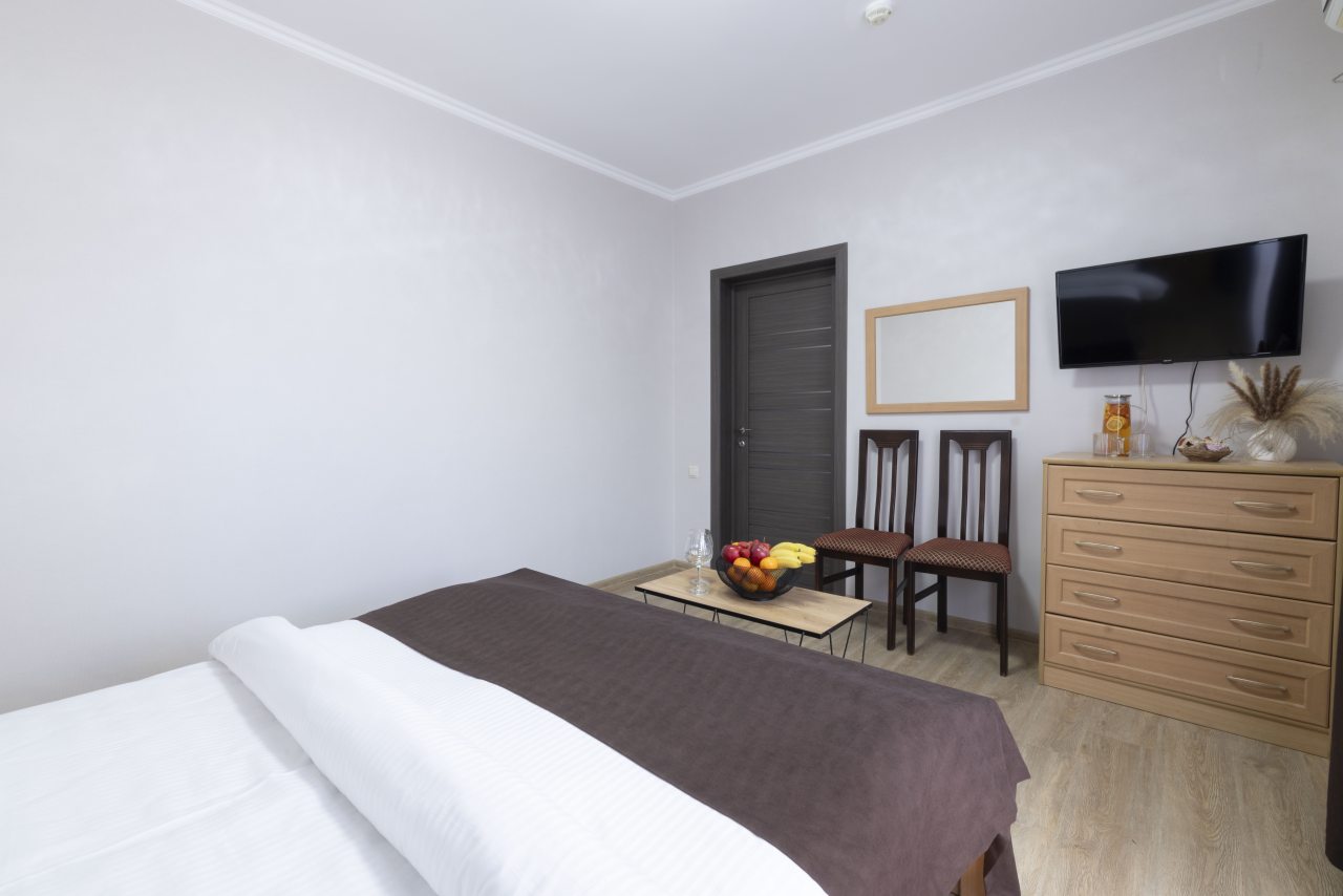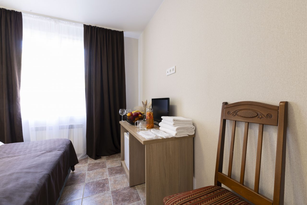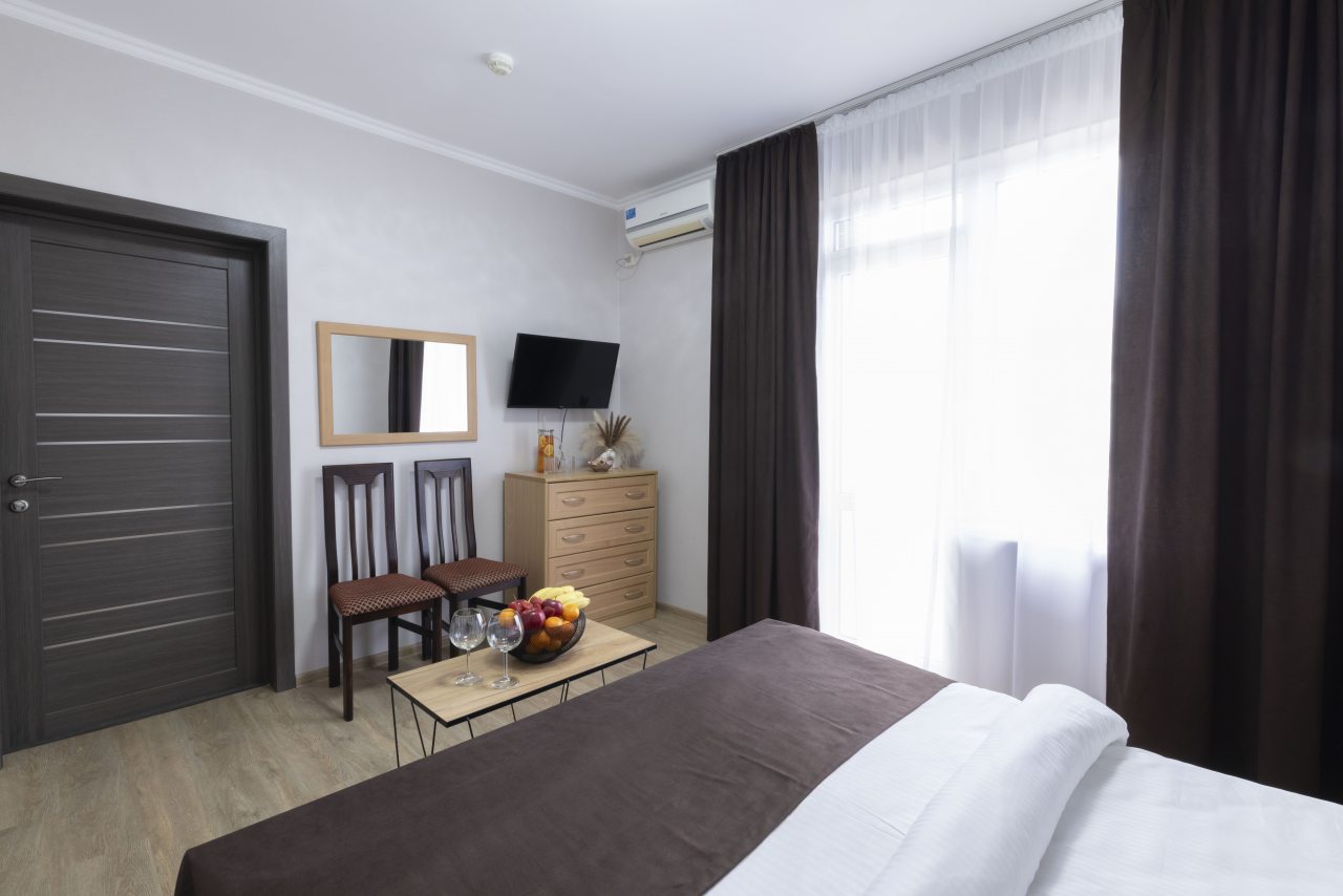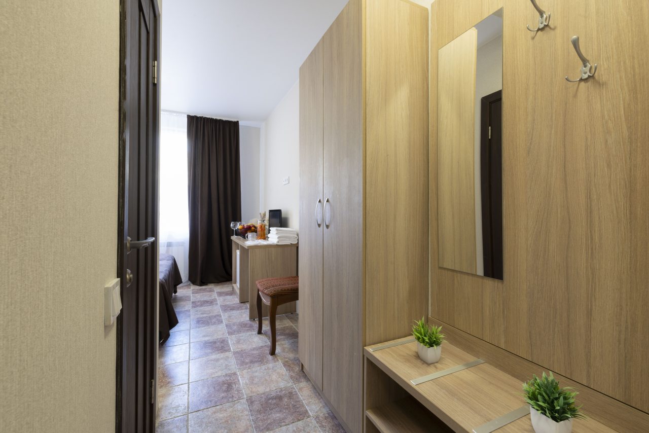 Отель небольшой, расположен на тихой улице, до ближайшего пляжа 5-7 минут ходьбы. В пешей доступности есть магазины, столовые, кафе, торговые ряды. Я проживала в номере на первом этаже, не большой номер с прихожей, удобная двуспальная кровать, мини холодильник, тумбы для хранения, два стула, есть кресло дополнительно, прихожая оборудованна вешалкой с небольшим зеркалом, номер без балкона, для сушки одежды есть раздвижная небольшая сушилка. Все чисто, отличное белье постельное, полотенца. Есть гладильная доска с утюгом в коридоре, кулер, микроволновка на ресепшине. Двор тоже не большой, есть бассейн.Сам отель находится в Имеритинском районе Адлера