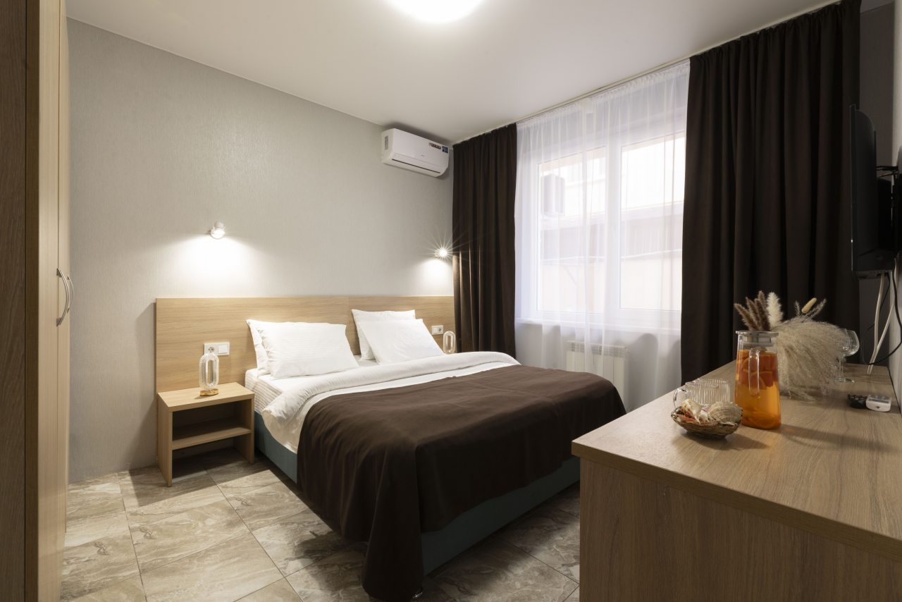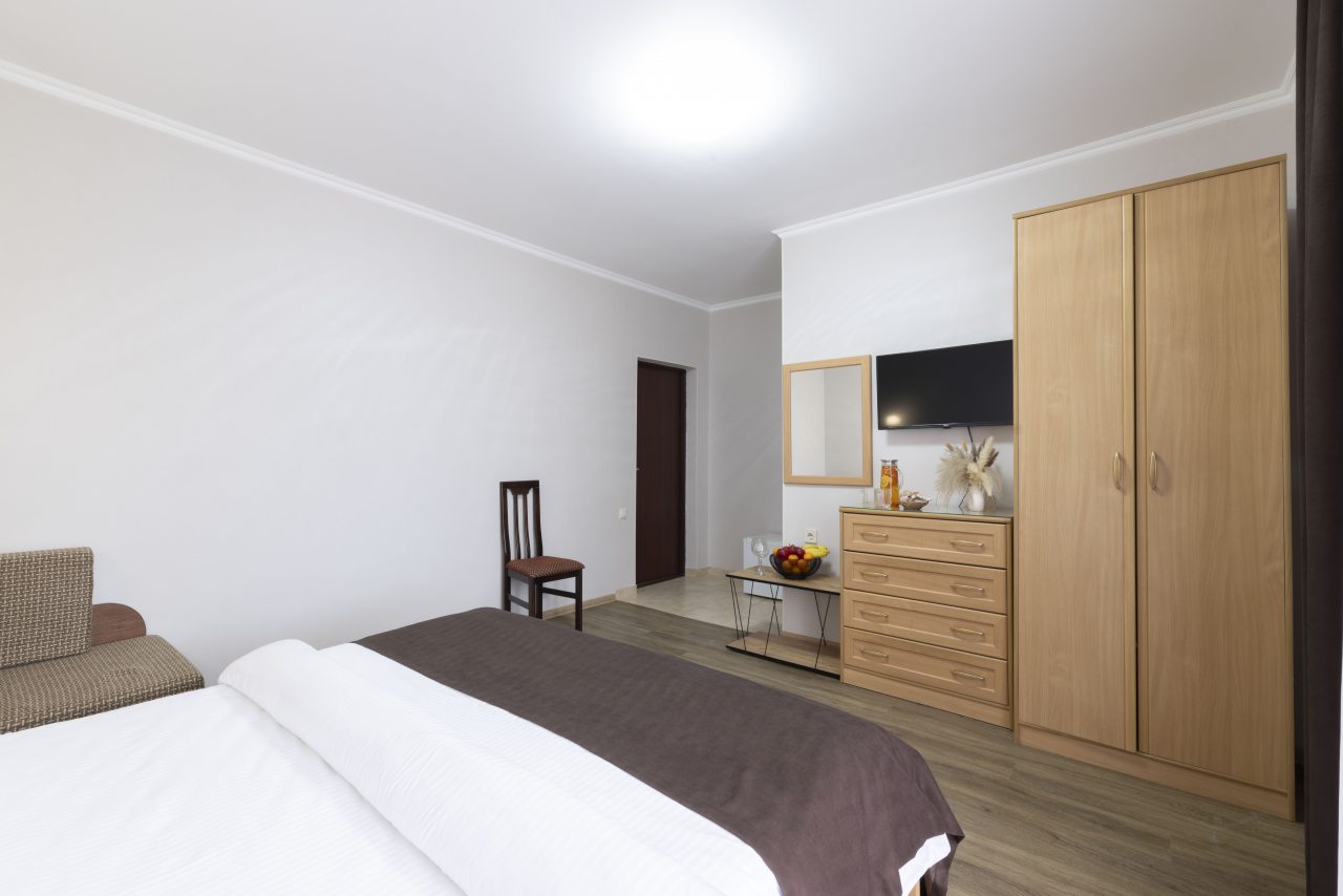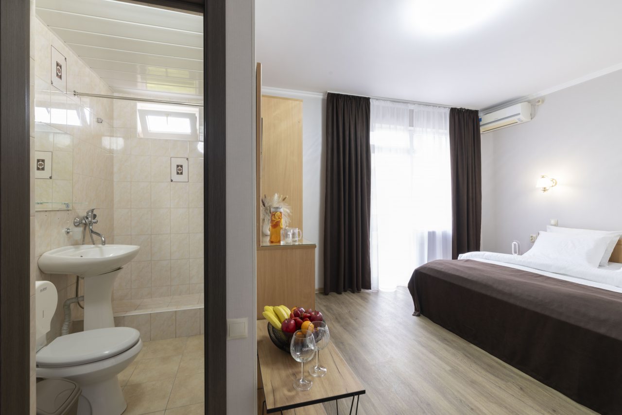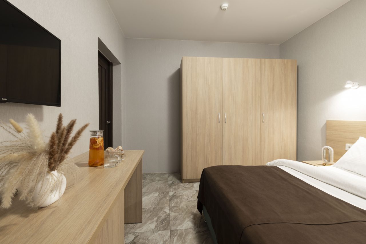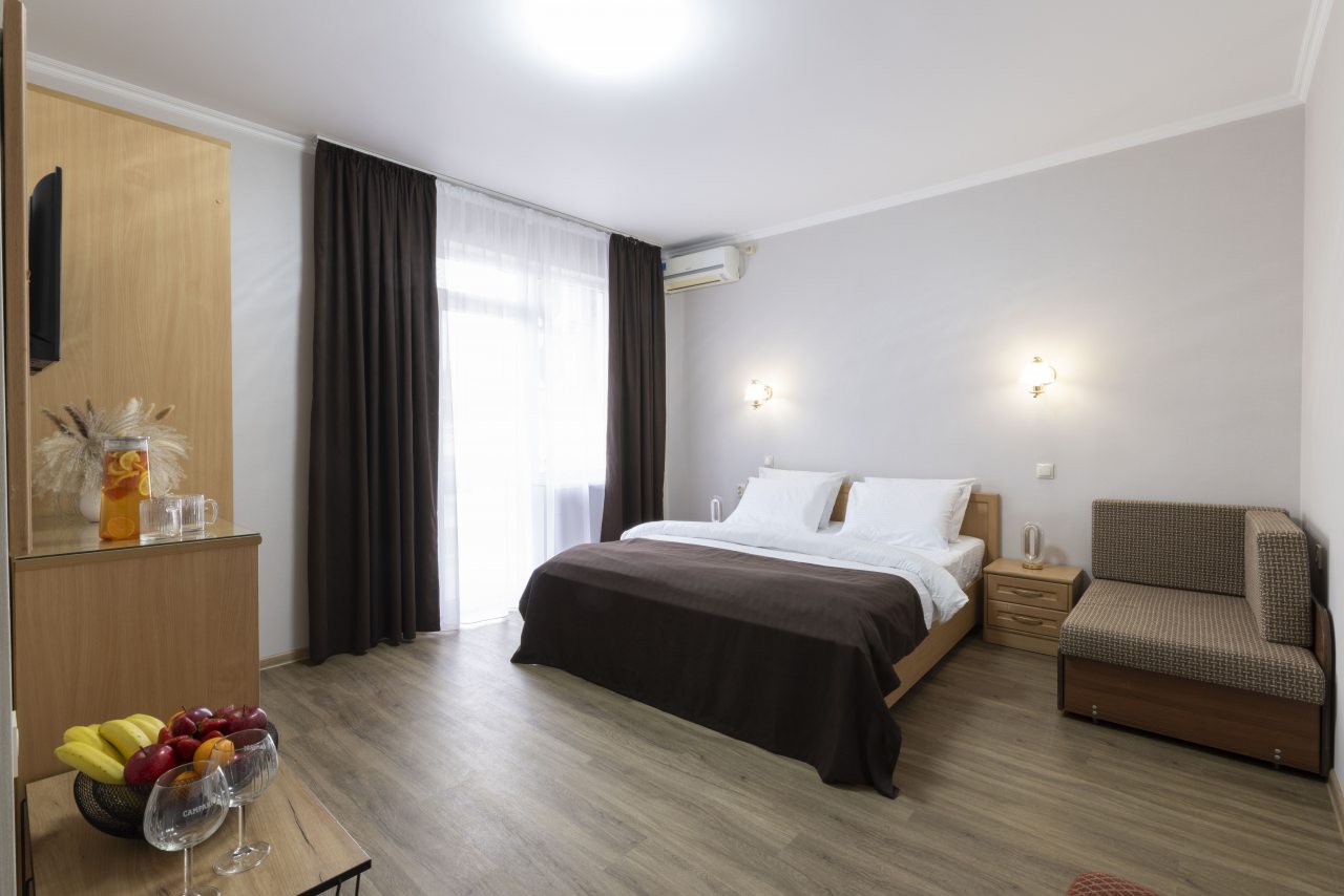 Отель небольшой, расположен на тихой улице, до ближайшего пляжа 5-7 минут ходьбы. В пешей доступности есть магазины, столовые, кафе, торговые ряды. Я проживала в номере на первом этаже, не большой номер с прихожей, удобная двуспальная кровать, мини холодильник, тумбы для хранения, два стула, есть кресло дополнительно, прихожая оборудованна вешалкой с небольшим зеркалом, номер без балкона, для сушки одежды есть раздвижная небольшая сушилка. Все чисто, отличное белье постельное, полотенца. Есть гладильная доска с утюгом в коридоре, кулер, микроволновка на ресепшине. Двор тоже не большой, есть бассейн.Сам отель находится в Имеритинском районе Адлера