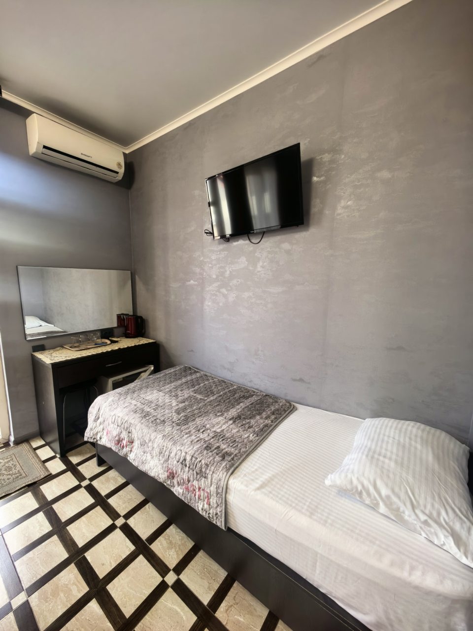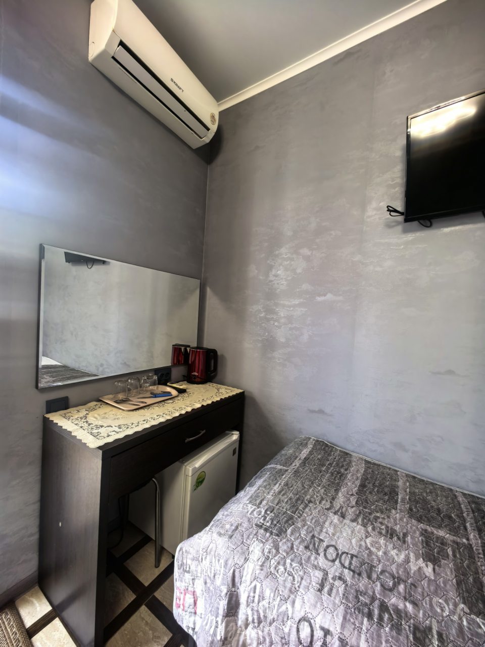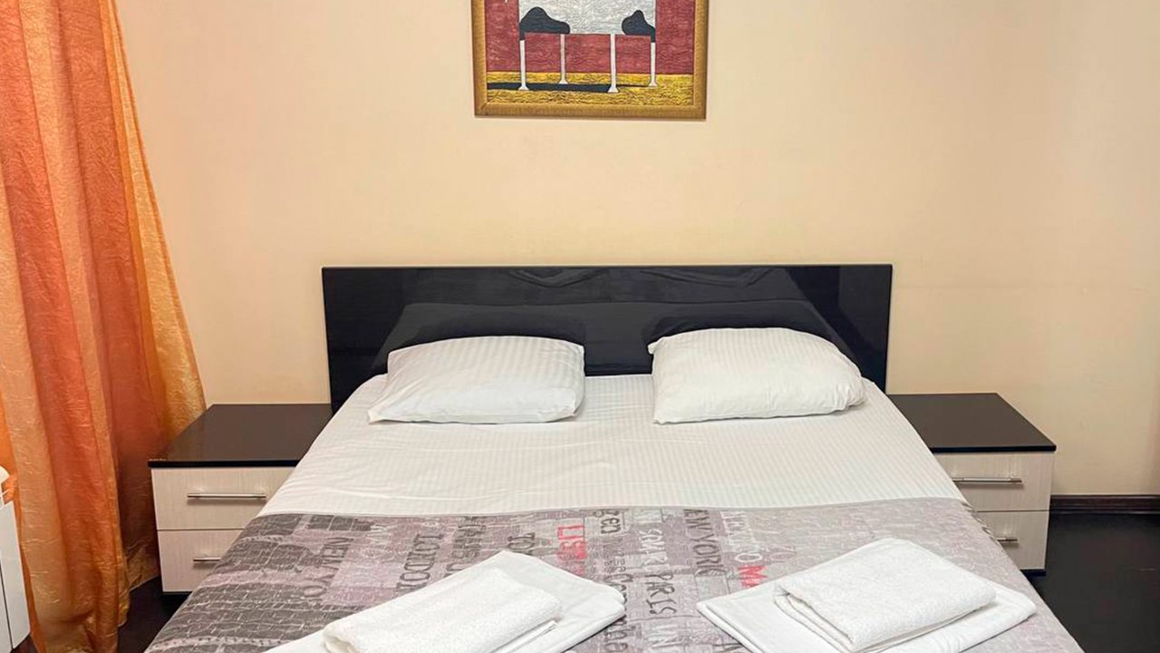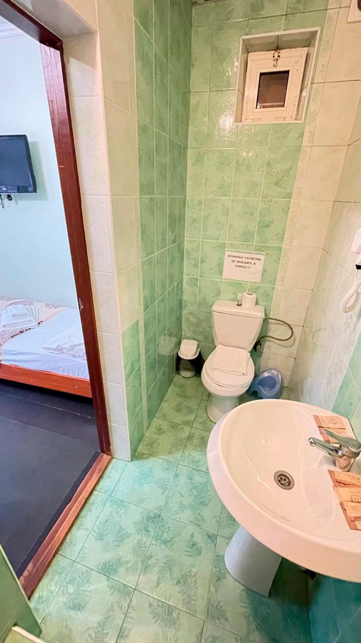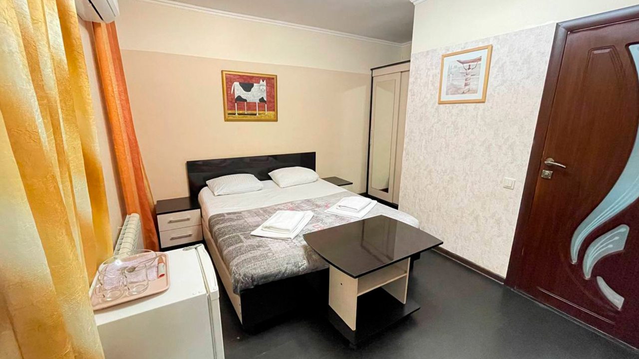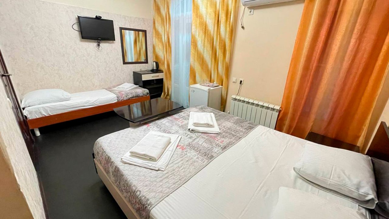 Отдыхала в начале декабря. Отель расположен в центре Адлера. Номер чистый, проживала одна в трёхместном номере. В номере есть кондиционер, телевизор, холодильник, чайник, посуда, вайфай, туалетный столик с зеркалом, огромный шкаф-купе с зеркальными дверями, потолок с подсветкой. Номер чистый, белье свежее, на территории отеля есть бассейн с подсветкой под открытым небом, температура воды 36 градусов. Чистый санузел, с душевой. Соседей не видела и не слышала, никто не мешал, ночью спала прекрасно, никаких шумов. Не довелось оценить кухню, так как питалась в в городе.