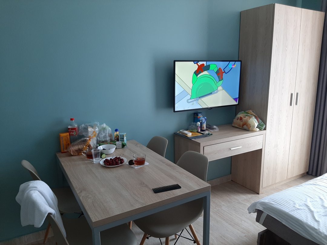 Апартаменты высочайшего класса. Есть все для комфортного проживания. Посуда, микроволновая печь, холодильник, стол и стулья. Проживали втроем в апартаментах с двумя комнатами, идеально. Два телевизора, большой диван для ребенка и двуспальная кровать. Теплый бассейн на шестом этаже, достаточно большой. Ребенок был очень доволен. Есть сауна, очень теплая, но за доп.цену. Расположение отеля очень удачное, рядом потрясающая набережная с множеством локации, кафе и ресторанов на любой вкус и кошелек. Вас ждёт тепло и уют в Шанти.